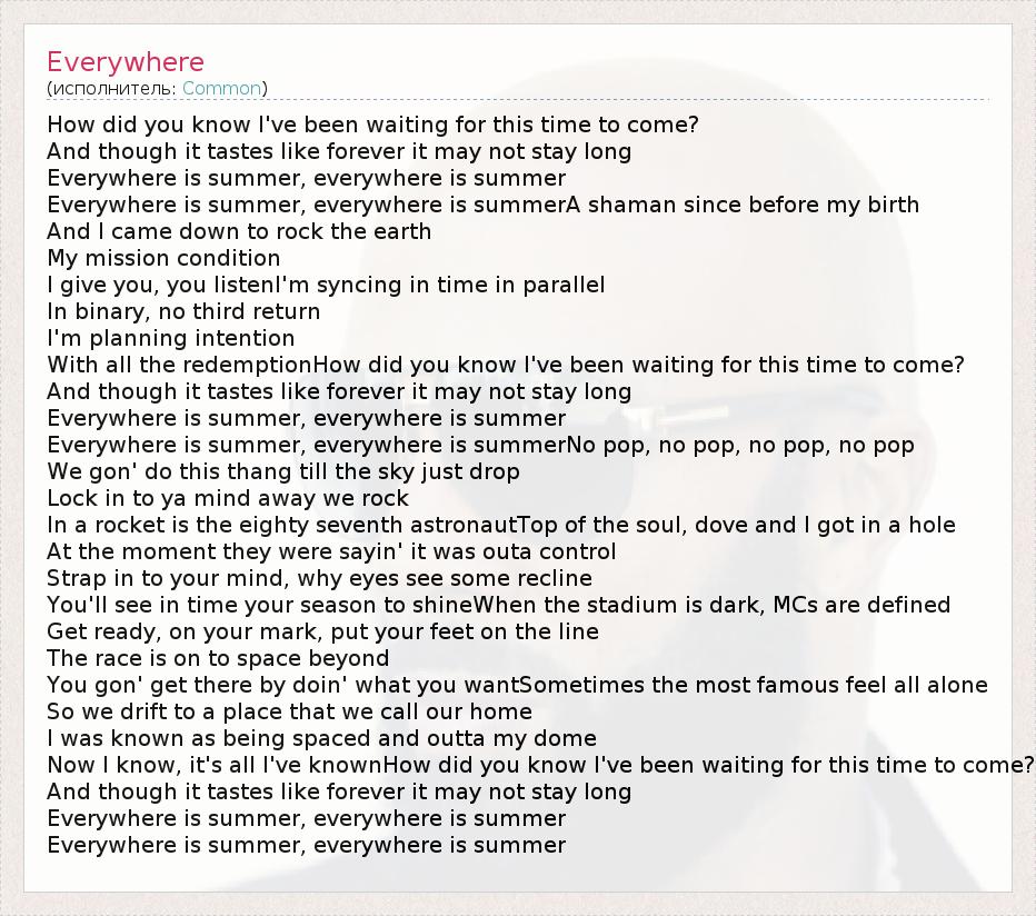 How did you know I've been waiting for this time to come? And though it tastes like forever it may not stay long Everywhere is summer, everywhere is summer Everywhere is summer, everywhere is summerA shaman since before my birth And I came down to rock the earth My mission condition I give you, you listenI'm syncing in time in parallel In binary, no third return I'm planning intention With all the redemptionHow did you know I've been waiting for this time to come? And though it tastes like forever it may not stay long Everywhere is summer, everywhere is summer Everywhere is summer, everywhere is summerNo pop, no pop, no pop, no pop We gon' do this thang till the sky just drop Lock in to ya mind away we rock In a rocket is the eighty seventh astronautTop of the soul, dove and I got in a hole At the moment they were sayin' it was outa control Strap in to your mind, why eyes see some recline You'll see in time your season to shineWhen the stadium is dark, MCs are defined Get ready, on your mark, put your feet on the line The race is on to space beyond You gon' get there by doin' what you wantSometimes the most famous feel all alone So we drift to a place that we call our home I was known as being spaced and outta my dome Now I know, it's all I've knownHow did you know I've been waiting for this time to come? And though it tastes like forever it may not stay long Everywhere is summer, everywhere is summer Everywhere is summer, everywhere is summer