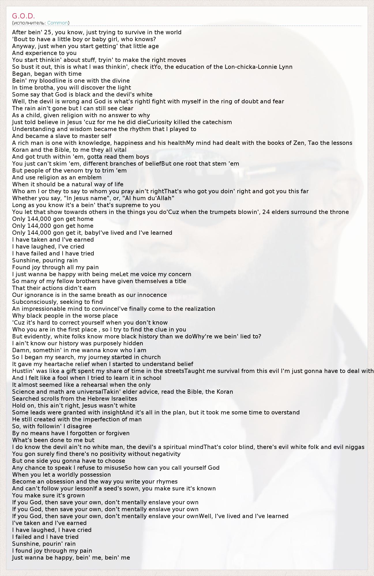 Это интересно:Common – это строгость и мягкость, красота и сила. Common – это стиль. Common -это сладкая вата и мягкий плед, оберег от невзгод и жаркое, всеобъемлющее солнце, греющее хип-хаперов по всей земле. Common – это лирика и теплый звук. Common – это корни хип-хопа в их современной заботливой интерпретации. В его музыку очень легко влюбиться, и влюбиться бесповоротно. Не сладкий, не перченый. Не слишком назидательный,... продолжение