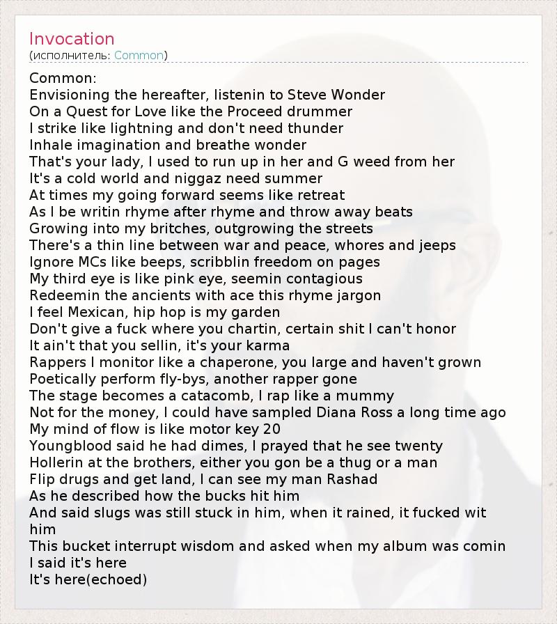 Это интересно:Common – это строгость и мягкость, красота и сила. Common – это стиль. Common -это сладкая вата и мягкий плед, оберег от невзгод и жаркое, всеобъемлющее солнце, греющее хип-хаперов по всей земле. Common – это лирика и теплый звук. Common – это корни хип-хопа в их современной заботливой интерпретации. В его музыку очень легко влюбиться, и влюбиться бесповоротно. Не сладкий, не перченый. Не слишком назидательный,... продолжение