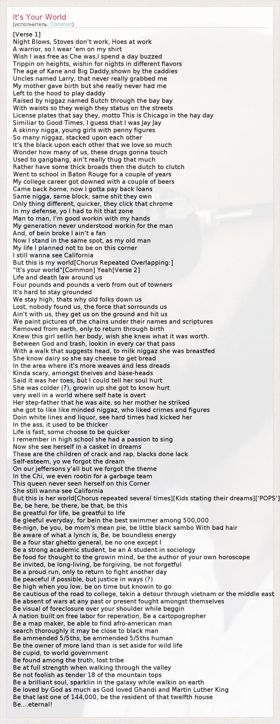 [Verse 1] Night Blows, Stoves don't work, Hoes at work A warrior, so I wear 'em on my shirt Wish I was free as Che was,I spend a day buzzed Trippin on heights, wishin for nights in different flavors The age of Kane and Big Daddy,shown by the caddies Uncles named Larry, that never really grabbed me My mother gave birth but she really never had me Left to the hood to play daddy Raised by niggaz named Butch through the bay bay With waists so they weigh they status on the streets License plates that say they, motto This is Chicago in the hay day Similiar to Good Times, I guess that I was Jay Jay A skinny nigga, young girls with penny figures So many niggaz, stacked upon each other It's the black upon each other that we love so much Wonder how many of us, these drugs gonna touch Used to gangbang, ain't really thug that much Rather have some thick broads then the dutch to clutch Went to school in Baton Rouge for a couple of years My college career got downed with a couple of beers Came back home, now I gotta pay back loans Same nigga, same block, same shit they own Only thing different, quicker, they click that chrome In my defense, yo I had to hit that zone Man to man, I'm good workin with my hands My generation never understood workin for the man And, of bein broke I ain't a fan Now I stand in the same spot, as my old man My life I planned not to be on this corner I still wanna see California But this is my world[Chorus Repeated Overlapping:] "It's your world"[Common] Yeah[Verse 2] Life and death law around us Four pounds and pounds a verb from out of towners It's hard to stay grounded We stay high, thats why old folks down us Lost, nobody found us, the force that sorrounds us Ain't with us, they get us on the ground and hit us We paint pictures of the chains under their names and scriptures Removed from earth, only to return through birth Knew this girl sellin her body, wish she knew what it was worth. Between God and trash, lookin in every car that pass With a walk that suggests head, to milk niggaz she was breastfed She know dairy so she say cheese to get bread In the area where it's more weaves and less dreads Kinda scary, amongst theives and base-heads Said it was her toes, but I could tell her soul hurt She was colder (?), growin up she got to know hurt very well in a world where self hate is overt Her step-father that he was aite, so her mother he striked she got to like like minded niggaz, who liked crimes and figures Doin white lines and liquor, see hard times had kicked her In the ass, it used to be thicker Life is fast, some choose to be quicker I remember in high school she had a passion to sing Now she see herself in a casket in dreams These are the children of crack and rap, blacks done lack Self-esteem, yo we forgot the dream On our jeffersons y'all but we forgot the theme In the Chi, we even rootin for a garbage team This queen never seen herself on this Corner She still wanna see California But this is her world[Chorus repeated several times][Kids stating their dreams]['POPS'] Be, be here, be there, be that, be this Be greatful for life, be greatful to life Be gleeful everyday, for bein the best swimmer among 500,000 Be-nign, be you, be mom's mean pie, be little black sambo With bad hair Be aware of what a lynch is, Be, be boundless energy Be a four star ghetto general, be no one except I Be a strong academic student, be an A student in sociology Be food for thought to the growin mind, be the author of your own horoscope Be invited, be long-living, be forgiving, be not forgetful Be a proud run, only to return to fight another day Be peaceful if possible, but justice in ways (?) Be high when you low, be on time but knowin to go Be cautious of the road to college, takin a detour through vietnam or the middle east Be absent of wars at any past or present fought amongst themselves Be visual of foreclosure over your shoulder while beggin A nation built on free labor for reperation, Be a cartopogropher Be a map maker, be able to find afro-american man search thoroughly it may be close to black man Be ammended 5/5ths, be ammended 5/5ths human Be the owner of more land than is set aside for wild life Be cupid, to world government Be found among the truth, lost tribe Be at full strength when walking through the valley Be not foolish as tender 18 of the mountain tops Be a brilliant soul, sparklin in the galaxy while walkin on earth Be loved by God as much as God loved Ghandi and Martin Luther King Be that last one of 144,000, be the resident of that twelfth house Be....eternal!