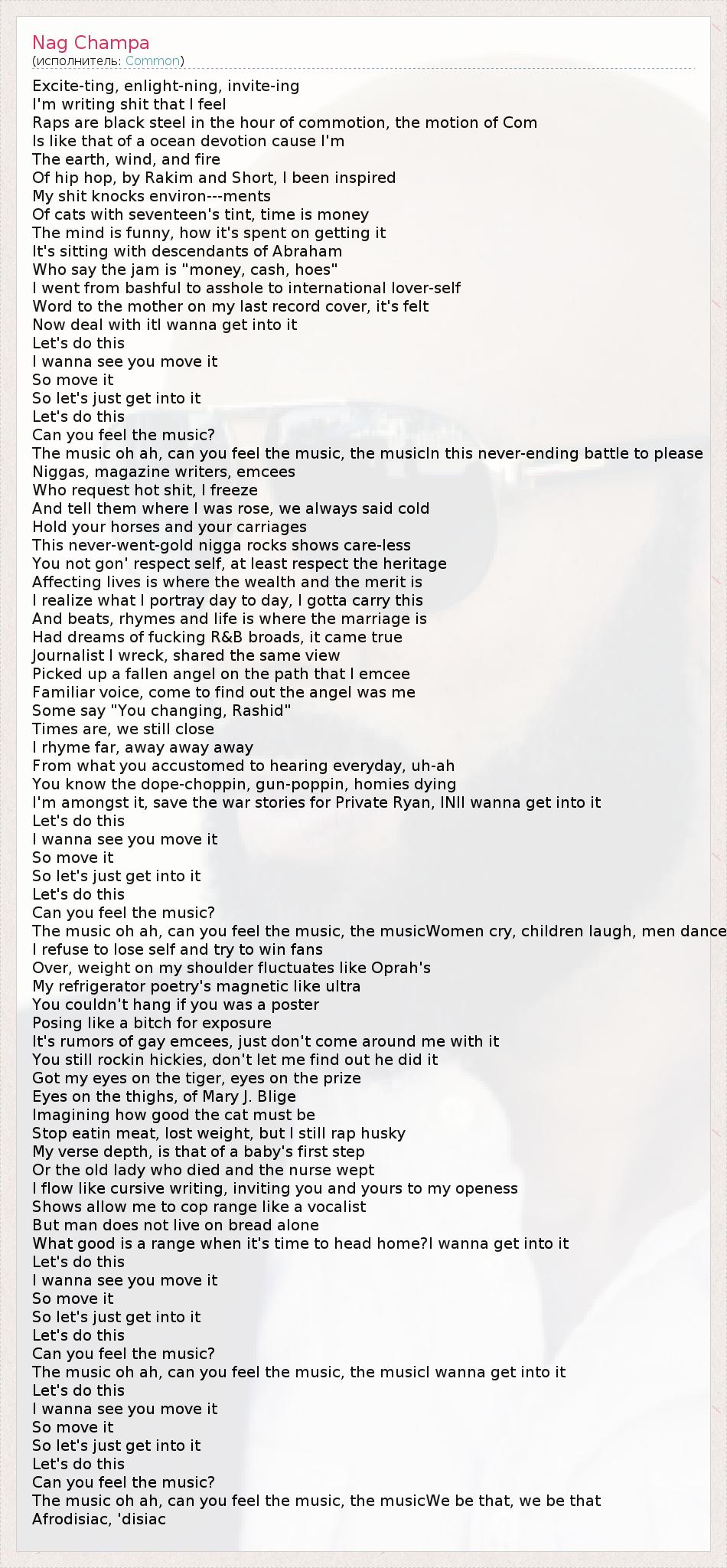 Это интересно:Common – это строгость и мягкость, красота и сила. Common – это стиль. Common -это сладкая вата и мягкий плед, оберег от невзгод и жаркое, всеобъемлющее солнце, греющее хип-хаперов по всей земле. Common – это лирика и теплый звук. Common – это корни хип-хопа в их современной заботливой интерпретации. В его музыку очень легко влюбиться, и влюбиться бесповоротно. Не сладкий, не перченый. Не слишком назидательный,... продолжение