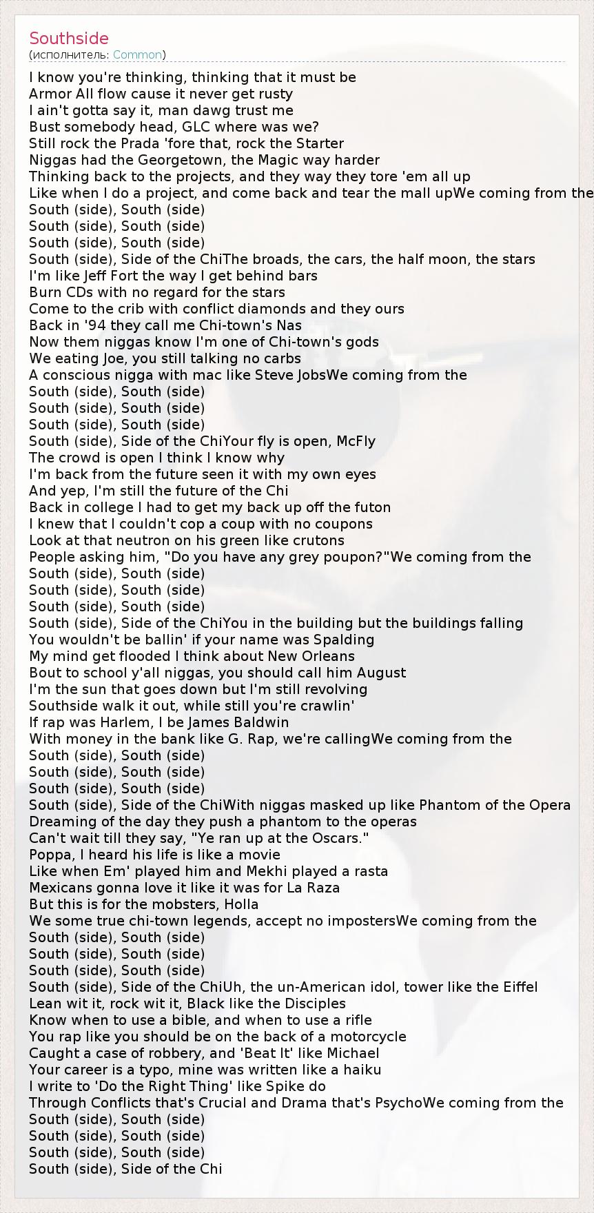 South (side), Side of the ChiThe broads, the cars, the half moon, the stars