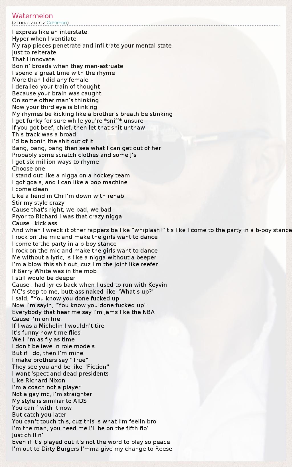Это интересно:Common – это строгость и мягкость, красота и сила. Common – это стиль. Common -это сладкая вата и мягкий плед, оберег от невзгод и жаркое, всеобъемлющее солнце, греющее хип-хаперов по всей земле. Common – это лирика и теплый звук. Common – это корни хип-хопа в их современной заботливой интерпретации. В его музыку очень легко влюбиться, и влюбиться бесповоротно. Не сладкий, не перченый. Не слишком назидательный,... продолжение
