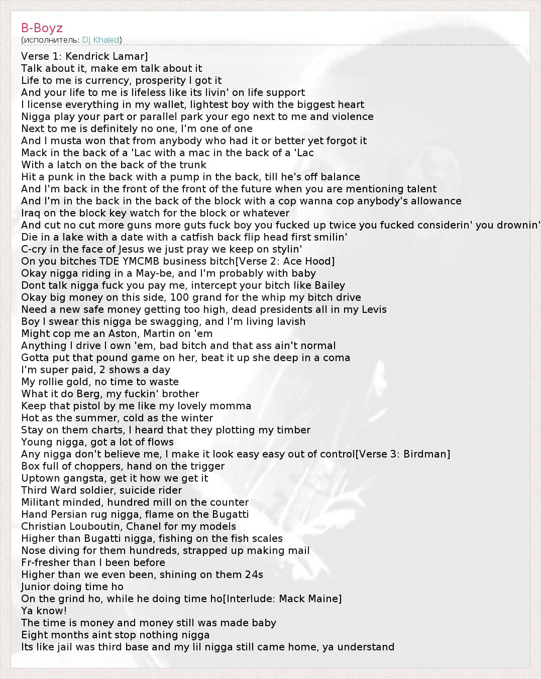 Verse 1: Kendrick Lamar] Talk about it, make em talk about it Life to me is currency, prosperity I got it And your life to me is lifeless like its livin' on life support I license everything in my wallet, lightest boy with the biggest heart Nigga play your part or parallel park your ego next to me and violence Next to me is definitely no one, I'm one of one And I musta won that from anybody who had it or better yet forgot it Mack in the back of a 'Lac with a mac in the back of a 'Lac With a latch on the back of the trunk Hit a punk in the back with a pump in the back, till he's off balance And I'm back in the front of the front of the future when you are mentioning talent And I'm in the back in the back of the block with a cop wanna cop anybody's allowance Iraq on the block key watch for the block or whatever And cut no cut more guns more guts fuck boy you fucked up twice you fucked considerin' you drownin' Die in a lake with a date with a catfish back flip head first smilin' C-cry in the face of Jesus we just pray we keep on stylin' On you bitches TDE YMCMB business bitch[Verse 2: Ace Hood] Okay nigga riding in a May-be, and I'm probably with baby Dont talk nigga fuck you pay me, intercept your bitch like Bailey Okay big money on this side, 100 grand for the whip my bitch drive Need a new safe money getting too high, dead presidents all in my Levis Boy I swear this nigga be swagging, and I'm living lavish Might cop me an Aston, Martin on 'em Anything I drive I own 'em, bad bitch and that ass ain't normal Gotta put that pound game on her, beat it up she deep in a coma I'm super paid, 2 shows a day My rollie gold, no time to waste What it do Berg, my fuckin' brother Keep that pistol by me like my lovely momma Hot as the summer, cold as the winter Stay on them charts, I heard that they plotting my timber Young nigga, got a lot of flows Any nigga don't believe me, I make it look easy easy out of control[Verse 3: Birdman] Box full of choppers, hand on the trigger Uptown gangsta, get it how we get it Third Ward soldier, suicide rider Militant minded, hundred mill on the counter Hand Persian rug nigga, flame on the Bugatti Christian Louboutin, Chanel for my models Higher than Bugatti nigga, fishing on the fish scales Nose diving for them hundreds, strapped up making mail Fr-fresher than I been before Higher than we even been, shining on them 24s Junior doing time ho On the grind ho, while he doing time ho[Interlude: Mack Maine] Ya know! The time is money and money still was made baby Eight months aint stop nothing nigga Its like jail was third base and my lil nigga still came home, ya understand