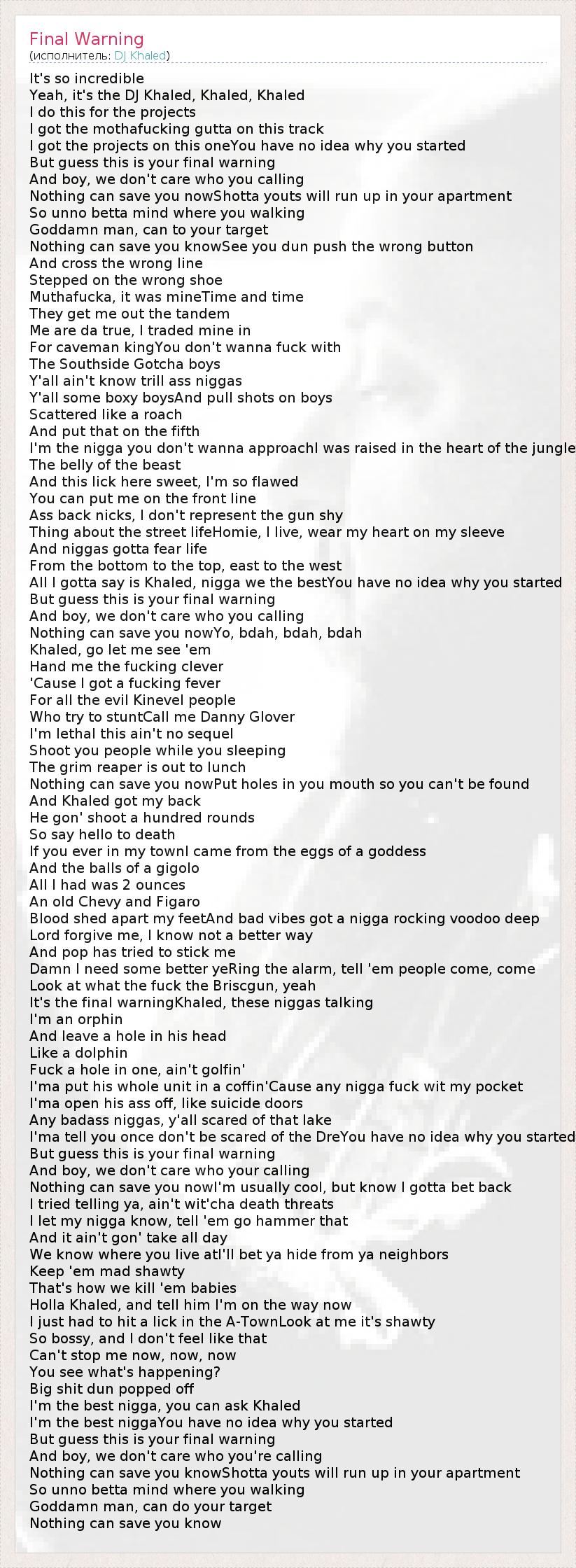 It's so incredible Yeah, it's the DJ Khaled, Khaled, Khaled I do this for the projects I got the mothafucking gutta on this track I got the projects on this oneYou have no idea why you started But guess this is your final warning And boy, we don't care who you calling Nothing can save you nowShotta youts will run up in your apartment So unno betta mind where you walking Goddamn man, can to your target Nothing can save you knowSee you dun push the wrong button And cross the wrong line Stepped on the wrong shoe Muthafucka, it was mineTime and time They get me out the tandem Me are da true, I traded mine in For caveman kingYou don't wanna fuck with The Southside Gotcha boys Y'all ain't know trill ass niggas Y'all some boxy boysAnd pull shots on boys Scattered like a roach And put that on the fifth I'm the nigga you don't wanna approachI was raised in the heart of the jungle The belly of the beast And this lick here sweet, I'm so flawed You can put me on the front line Ass back nicks, I don't represent the gun shy Thing about the street lifeHomie, I live, wear my heart on my sleeve And niggas gotta fear life From the bottom to the top, east to the west All I gotta say is Khaled, nigga we the bestYou have no idea why you started But guess this is your final warning And boy, we don't care who you calling Nothing can save you nowYo, bdah, bdah, bdah Khaled, go let me see 'em Hand me the fucking clever 'Cause I got a fucking fever For all the evil Kinevel people Who try to stuntCall me Danny Glover I'm lethal this ain't no sequel Shoot you people while you sleeping The grim reaper is out to lunch Nothing can save you nowPut holes in you mouth so you can't be found And Khaled got my back He gon' shoot a hundred rounds So say hello to death If you ever in my townI came from the eggs of a goddess And the balls of a gigolo All I had was 2 ounces An old Chevy and Figaro Blood shed apart my feetAnd bad vibes got a nigga rocking voodoo deep Lord forgive me, I know not a better way And pop has tried to stick me Damn I need some better yeRing the alarm, tell 'em people come, come Look at what the fuck the Briscgun, yeah It's the final warningKhaled, these niggas talking I'm an orphin And leave a hole in his head Like a dolphin Fuck a hole in one, ain't golfin' I'ma put his whole unit in a coffin'Cause any nigga fuck wit my pocket I'ma open his ass off, like suicide doors Any badass niggas, y'all scared of that lake I'ma tell you once don't be scared of the DreYou have no idea why you started But guess this is your final warning And boy, we don't care who your calling Nothing can save you nowI'm usually cool, but know I gotta bet back I tried telling ya, ain't wit'cha death threats I let my nigga know, tell 'em go hammer that And it ain't gon' take all day We know where you live atI'll bet ya hide from ya neighbors Keep 'em mad shawty That's how we kill 'em babies Holla Khaled, and tell him I'm on the way now I just had to hit a lick in the A-TownLook at me it's shawty So bossy, and I don't feel like that Can't stop me now, now, now You see what's happening? Big shit dun popped off I'm the best nigga, you can ask Khaled I'm the best niggaYou have no idea why you started But guess this is your final warning And boy, we don't care who you're calling Nothing can save you knowShotta youts will run up in your apartment So unno betta mind where you walking Goddamn man, can do your target Nothing can save you know