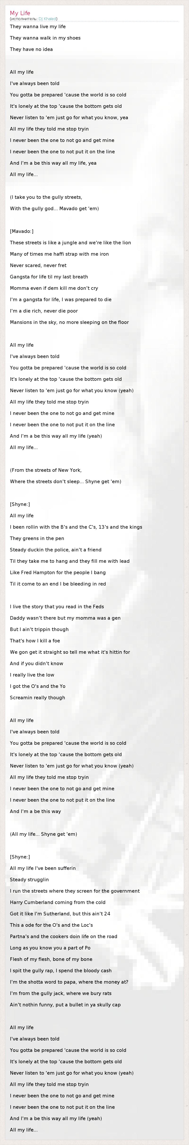 They wanna live my life They wanna walk in my shoes They have no idea All my life I've always been told You gotta be prepared 'cause the world is so cold It's lonely at the top 'cause the bottom gets old Never listen to 'em just go for what you know, yea All my life they told me stop tryin I never been the one to not go and get mine I never been the one to not put it on the line And I'm a be this way all my life, yea All my life... (I take you to the gully streets, With the gully god... Mavado get 'em) [Mavado:] These streets is like a jungle and we're like the lion Many of times me haffi strap with me iron Never scared, never fret Gangsta for life til my last breath Momma even if dem kill me don't cry I'm a gangsta for life, I was prepared to die I'm a die rich, never die poor Mansions in the sky, no more sleeping on the floor All my life I've always been told You gotta be prepared 'cause the world is so cold It's lonely at the top 'cause the bottom gets old Never listen to 'em just go for what you know (yeah) All my life they told me stop tryin I never been the one to not go and get mine I never been the one to not put it on the line And I'm a be this way all my life (yeah) All my life... (From the streets of New York, Where the streets don't sleep... Shyne get 'em) [Shyne:] All my life I been rollin with the B's and the C's, 13's and the kings They greens in the pen Steady duckin the police, ain't a friend Til they take me to hang and they fill me with lead Like Fred Hampton for the people I bang Til it come to an end I be bleeding in red I live the story that you read in the Feds Daddy wasn't there but my momma was a gen But I ain't trippin though That's how I kill a foe We gon get it straight so tell me what it's hittin for And if you didn't know I really live the low I got the O's and the Yo Screamin really though All my life I've always been told You gotta be prepared 'cause the world is so cold It's lonely at the top 'cause the bottom gets old Never listen to 'em just go for what you know (yeah) All my life they told me stop tryin I never been the one to not go and get mine I never been the one to not put it on the line And I'm a be this way (All my life... Shyne get 'em) [Shyne:] All my life I've been sufferin Steady strugglin I run the streets where they screen for the government Harry Cumberland coming from the cold Got it like I'm Sutherland, but this ain't 24 This a ode for the O's and the Loc's Partna's and the cookers doin life on the road Long as you know you a part of Po Flesh of my flesh, bone of my bone I spit the gully rap, I spend the bloody cash I'm the shotta word to papa, where the money at? I'm from the gully jack, where we bury rats Ain't nothin funny, put a bullet in ya skully cap All my life I've always been told You gotta be prepared 'cause the world is so cold It's lonely at the top 'cause the bottom gets old Never listen to 'em just go for what you know (yeah) All my life they told me stop tryin I never been the one to not go and get mine I never been the one to not put it on the line And I'm a be this way all my life (yeah) All my life...