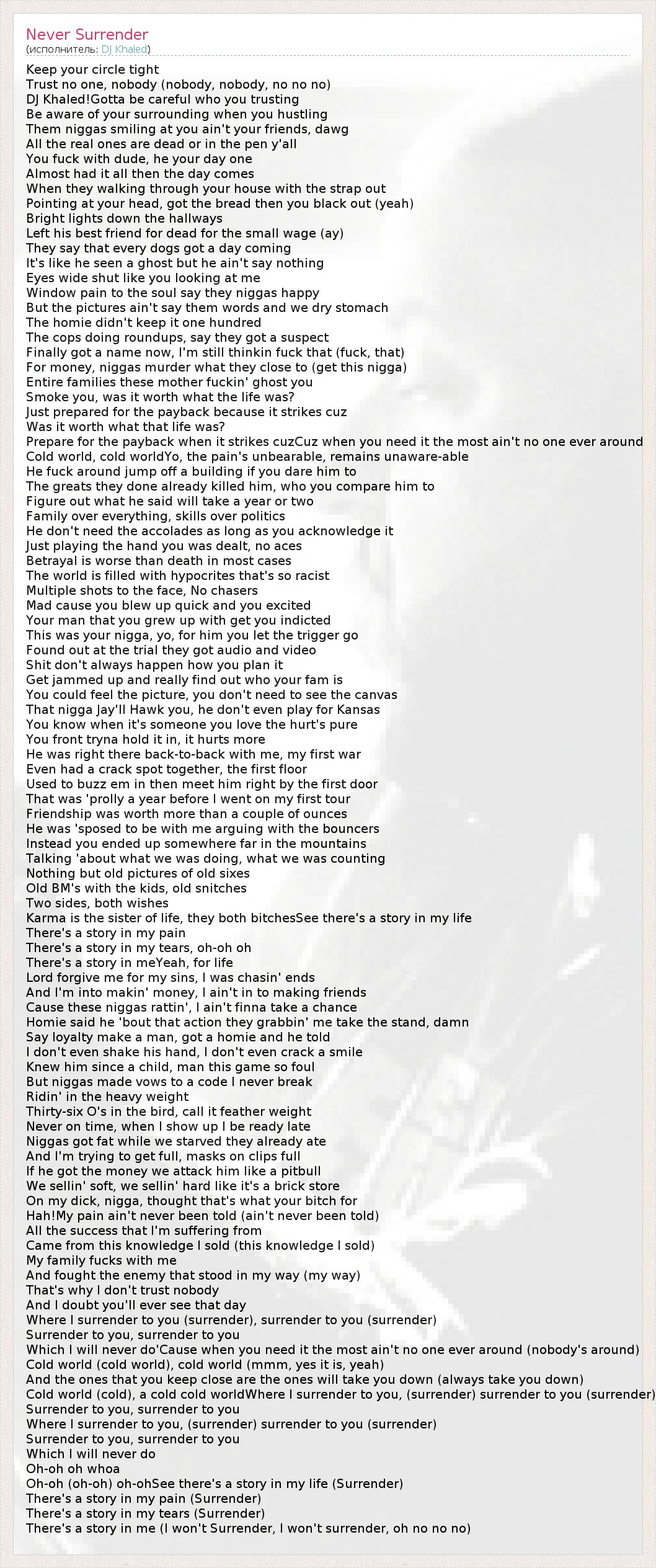 Keep your circle tight Trust no one, nobody (nobody, nobody, no no no) DJ Khaled!Gotta be careful who you trusting Be aware of your surrounding when you hustling Them niggas smiling at you ain't your friends, dawg All the real ones are dead or in the pen y'all You fuck with dude, he your day one Almost had it all then the day comes When they walking through your house with the strap out Pointing at your head, got the bread then you black out (yeah) Bright lights down the hallways Left his best friend for dead for the small wage (ay) They say that every dogs got a day coming It's like he seen a ghost but he ain't say nothing Eyes wide shut like you looking at me Window pain to the soul say they niggas happy But the pictures ain't say them words and we dry stomach The homie didn't keep it one hundred The cops doing roundups, say they got a suspect Finally got a name now, I'm still thinkin fuck that (fuck, that) For money, niggas murder what they close to (get this nigga) Entire families these mother fuckin' ghost you Smoke you, was it worth what the life was? Just prepared for the payback because it strikes cuz Was it worth what that life was? Prepare for the payback when it strikes cuzCuz when you need it the most ain't no one ever around Cold world, cold worldYo, the pain's unbearable, remains unaware-able He fuck around jump off a building if you dare him to The greats they done already killed him, who you compare him to Figure out what he said will take a year or two Family over everything, skills over politics He don't need the accolades as long as you acknowledge it Just playing the hand you was dealt, no aces Betrayal is worse than death in most cases The world is filled with hypocrites that's so racist Multiple shots to the face, No chasers Mad cause you blew up quick and you excited Your man that you grew up with get you indicted This was your nigga, yo, for him you let the trigger go Found out at the trial they got audio and video Shit don't always happen how you plan it Get jammed up and really find out who your fam is You could feel the picture, you don't need to see the canvas That nigga Jay'll Hawk you, he don't even play for Kansas You know when it's someone you love the hurt's pure You front tryna hold it in, it hurts more He was right there back-to-back with me, my first war Even had a crack spot together, the first floor Used to buzz em in then meet him right by the first door That was 'prolly a year before I went on my first tour Friendship was worth more than a couple of ounces He was 'sposed to be with me arguing with the bouncers Instead you ended up somewhere far in the mountains Talking 'about what we was doing, what we was counting Nothing but old pictures of old sixes Old BM's with the kids, old snitches Two sides, both wishes Karma is the sister of life, they both bitchesSee there's a story in my life There's a story in my pain There's a story in my tears, oh-oh oh There's a story in meYeah, for life Lord forgive me for my sins, I was chasin' ends And I'm into makin' money, I ain't in to making friends Cause these niggas rattin', I ain't finna take a chance Homie said he 'bout that action they grabbin' me take the stand, damn Say loyalty make a man, got a homie and he told I don't even shake his hand, I don't even crack a smile Knew him since a child, man this game so foul But niggas made vows to a code I never break Ridin' in the heavy weight Thirty-six O's in the bird, call it feather weight Never on time, when I show up I be ready late Niggas got fat while we starved they already ate And I'm trying to get full, masks on clips full If he got the money we attack him like a pitbull We sellin' soft, we sellin' hard like it's a brick store On my dick, nigga, thought that's what your bitch for Hah!My pain ain't never been told (ain't never been told) All the success that I'm suffering from Came from this knowledge I sold (this knowledge I sold) My family fucks with me And fought the enemy that stood in my way (my way) That's why I don't trust nobody And I doubt you'll ever see that day Where I surrender to you (surrender), surrender to you (surrender) Surrender to you, surrender to you Which I will never do'Cause when you need it the most ain't no one ever around (nobody's around) Cold world (cold world), cold world (mmm, yes it is, yeah) And the ones that you keep close are the ones will take you down (always take you down) Cold world (cold), a cold cold worldWhere I surrender to you, (surrender) surrender to you (surrender) Surrender to you, surrender to you Where I surrender to you, (surrender) surrender to you (surrender) Surrender to you, surrender to you Which I will never do Oh-oh oh whoa Oh-oh (oh-oh) oh-ohSee there's a story in my life (Surrender) There's a story in my pain (Surrender) There's a story in my tears (Surrender) There's a story in me (I won't Surrender, I won't surrender, oh no no no)