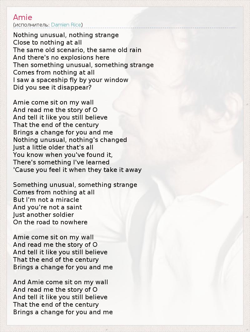Эми Ничего необычного, ничего странного, Совсем ничего, Тот же старый сценарий, тот же старый дождь, И никаких вспышек здесь, А потом что-то необычное, что-то странное, Появляется из ничего, Я видел космический корабль улетел из твоего окна, Ты видела как он исчез? Эми, приходи посидеть ко мне у стены, и прочитай мне историю об О И скажи. что ты все ещё веришь, Что конец века, Изменит что-то для тебя и меня, Ничего необычного, ничего не произошло, Просто стали немного старше, Ты знаешь. если найти что-то, Потом уяснишь, Что ощущаешь. когда это забирают у тебя. Что-то необычное, что-то странное, Появляется из ничего, Но я не чудо, И ты не святая, Просто ещё один солдат, На дороге в никуда. Эми, приходи посидеть ко мне у стены, и прочитай мне историю об О И скажи. что ты все ещё веришь, Что конец века, Изменит что-то для тебя и меня. Эми, приходи посидеть ко мне у стены, и прочитай мне историю об О И скажи. что ты все ещё веришь, Что конец века, Изменит что-то для тебя и меня.