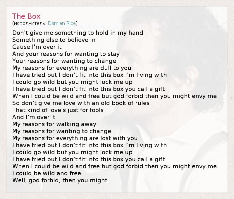 Don't give me something to hold in my hand Something else to believe in Cause I'm over it And your reasons for wanting to stay Your reasons for wanting to change My reasons for everything are dull to you I have tried but I don't fit into this box I'm living with I could go wild but you might lock me up I have tried but I don't fit into this box you call a gift When I could be wild and free but god forbid then you might envy me So don't give me love with an old book of rules That kind of love's just for fools And I'm over it My reasons for walking away My reasons for wanting to change My reasons for everything are lost with you I have tried but I don't fit into this box I'm living with I could go wild but you might lock me up I have tried but I don't fit into this box you call a gift When I could be wild and free but god forbid then you might envy me I could be wild and free Well, god forbid, then you might
