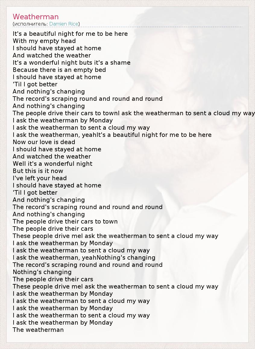 It's a beautiful night for me to be here With my empty head I should have stayed at home And watched the weather It's a wonderful night buts it's a shame Because there is an empty bed I should have stayed at home 'Til I got better And nothing's changing The record's scraping round and round and round And nothing's changing The people drive their cars to townI ask the weatherman to sent a cloud my way I ask the weatherman by Monday I ask the weatherman to sent a cloud my way I ask the weatherman, yeahIt's a beautiful night for me to be here Now our love is dead I should have stayed at home And watched the weather Well it's a wonderful night But this is it now I've left your head I should have stayed at home 'Til I got better And nothing's changing The record's scraping round and round and round And nothing's changing The people drive their cars to town The people drive their cars These people drive meI ask the weatherman to sent a cloud my way I ask the weatherman by Monday I ask the weatherman to sent a cloud my way I ask the weatherman, yeahNothing's changing The record's scraping round and round and round Nothing's changing The people drive their cars These people drive meI ask the weatherman to sent a cloud my way I ask the weatherman by Monday I ask the weatherman to sent a cloud my way I ask the weatherman by Monday I ask the weatherman to sent a cloud my way I ask the weatherman by Monday The weatherman