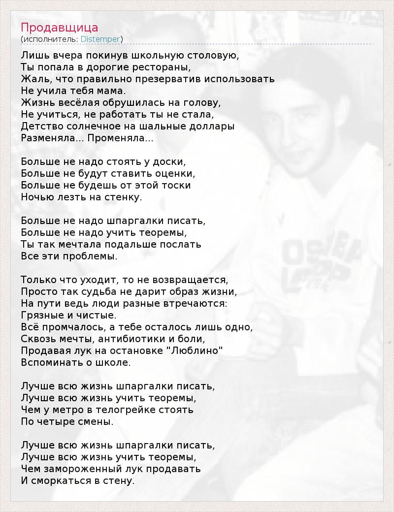 Лишь вчера покинув школьную столовую, Ты попала в дорогие рестораны, Жаль, что правильно презерватив использовать Не учила тебя мама. Жизнь весёлая обрушилась на голову, Не учиться, не работать ты не стала, Детство солнечное на шальные доллары Разменяла... Променяла... Больше не надо стоять у доски, Больше не будут ставить оценки, Больше не будешь от этой тоски Ночью лезть на стенку. Больше не надо шпаргалки писать, Больше не надо учить теоремы, Ты так мечтала подальше послать Все эти проблемы. Только что уходит, то не возвращается, Просто так судьба не дарит образ жизни, На пути ведь люди разные втречаются: Грязные и чистые. Всё промчалось, а тебе осталось лишь одно, Сквозь мечты, антибиотики и боли, Продавая лук на остановке "Люблино" Вспоминать о школе. Лучше всю жизнь шпаргалки писать, Лучше всю жизнь учить теоремы, Чем у метро в телогрейке стоять По четыре смены. Лучше всю жизнь шпаргалки писать, Лучше всю жизнь учить теоремы, Чем замороженный лук продавать И сморкаться в стену.