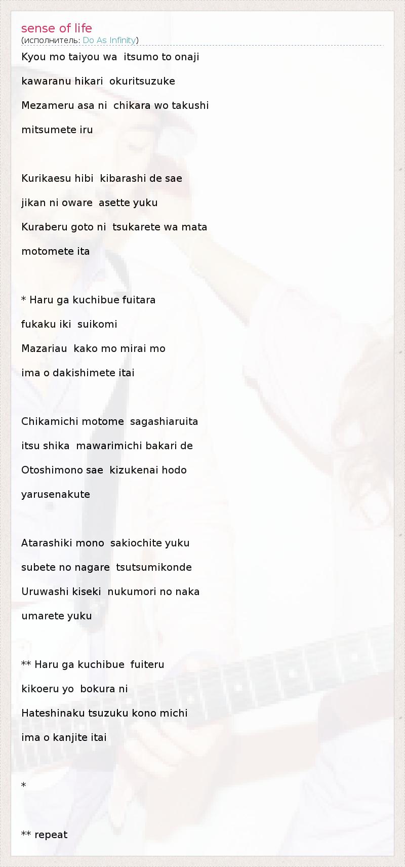 Это интересно:Do As Infinity (D.A.I.) - это вокалистка Томико Ван (伴都美子), гитарист Рё Оватари (Owatari Ryo) и композитор Дай Нагао(Nagao Dai). D.A.I был одним из самых популярных J-pop коллективов в Японии и в мире вообще. Их песни звучали в японских телепередачах, кинофильмах и аниме.Группа сыграла свой последний "живой" концерт в токийском "Ниппон Будокан" и распалась в сентябре... продолжение