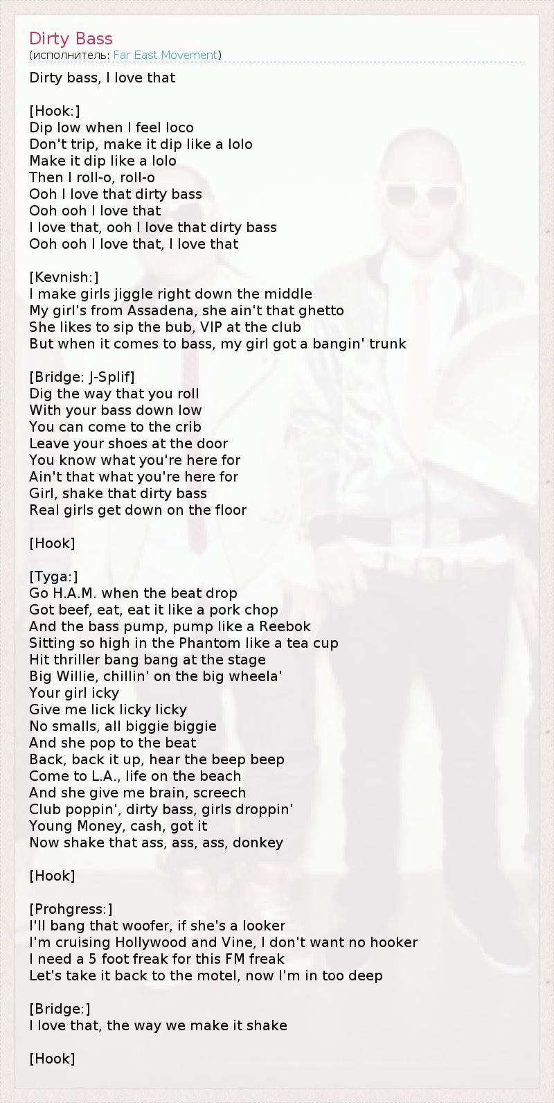 Dirty bass, I love that [Hook:] Dip low when I feel loco Don't trip, make it dip like a lolo Make it dip like a lolo Then I roll-o, roll-o Ooh I love that dirty bass Ooh ooh I love that I love that, ooh I love that dirty bass Ooh ooh I love that, I love that [Kevnish:] I make girls jiggle right down the middle My girl's from Assadena, she ain't that ghetto She likes to sip the bub, VIP at the club But when it comes to bass, my girl got a bangin' trunk [Bridge: J-Splif] Dig the way that you roll With your bass down low You can come to the crib Leave your shoes at the door You know what you're here for Ain't that what you're here for Girl, shake that dirty bass Real girls get down on the floor [Hook] [Tyga:] Go H.A.M. when the beat drop Got beef, eat, eat it like a pork chop And the bass pump, pump like a Reebok Sitting so high in the Phantom like a tea cup Hit thriller bang bang at the stage Big Willie, chillin' on the big wheela' Your girl icky Give me lick licky licky No smalls, all biggie biggie And she pop to the beat Back, back it up, hear the beep beep Come to L.A., life on the beach And she give me brain, screech Club poppin', dirty bass, girls droppin' Young Money, cash, got it Now shake that ass, ass, ass, donkey [Hook] [Prohgress:] I'll bang that woofer, if she's a looker I'm cruising Hollywood and Vine, I don't want no hooker I need a 5 foot freak for this FM freak Let's take it back to the motel, now I'm in too deep [Bridge:] I love that, the way we make it shake [Hook]