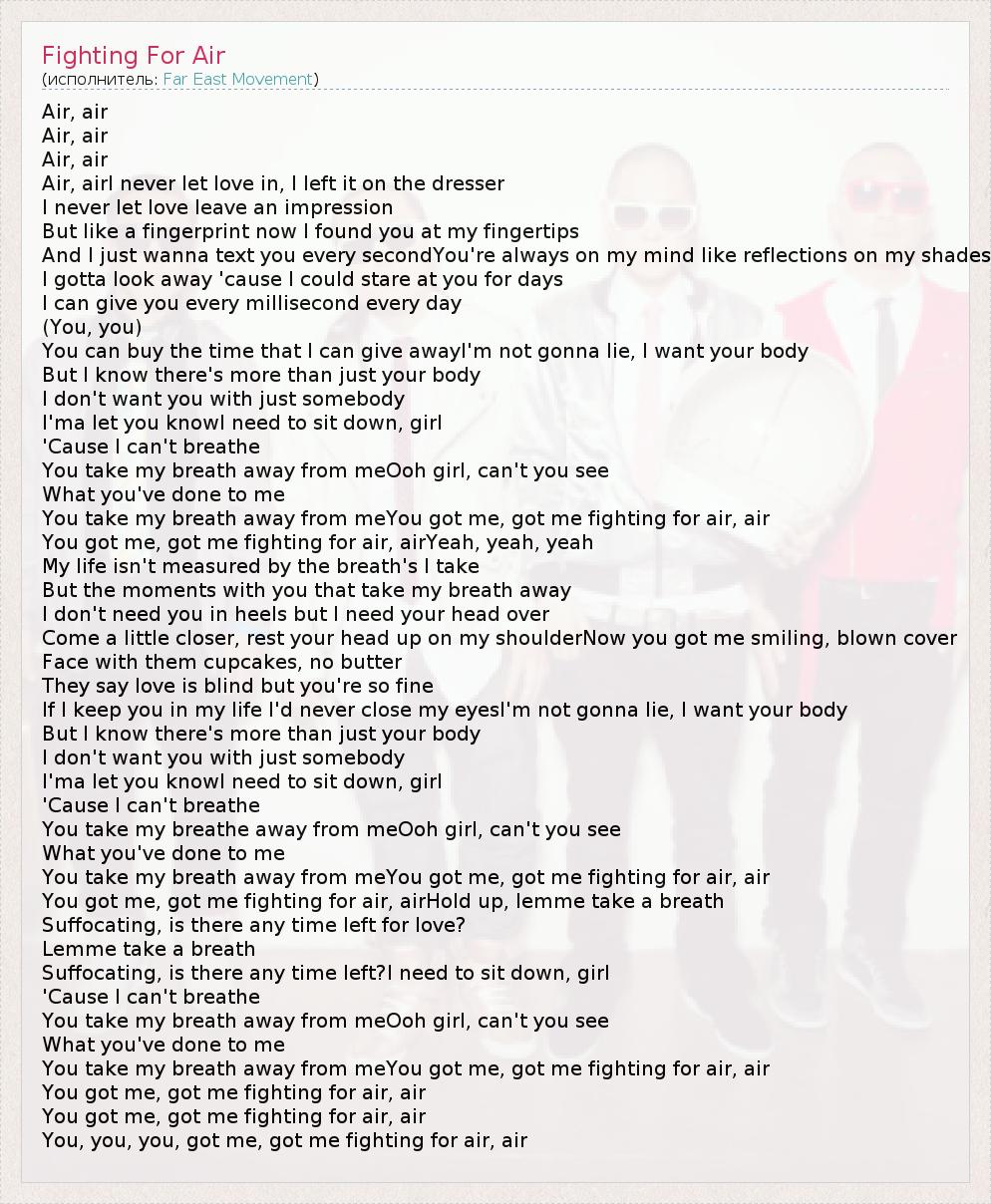 Air, air Air, air Air, air Air, airI never let love in, I left it on the dresser I never let love leave an impression But like a fingerprint now I found you at my fingertips And I just wanna text you every secondYou're always on my mind like reflections on my shades I gotta look away 'cause I could stare at you for days I can give you every millisecond every day (You, you) You can buy the time that I can give awayI'm not gonna lie, I want your body But I know there's more than just your body I don't want you with just somebody I'ma let you knowI need to sit down, girl 'Cause I can't breathe You take my breath away from meOoh girl, can't you see What you've done to me You take my breath away from meYou got me, got me fighting for air, air You got me, got me fighting for air, airYeah, yeah, yeah My life isn't measured by the breath's I take But the moments with you that take my breath away I don't need you in heels but I need your head over Come a little closer, rest your head up on my shoulderNow you got me smiling, blown cover Face with them cupcakes, no butter They say love is blind but you're so fine If I keep you in my life I'd never close my eyesI'm not gonna lie, I want your body But I know there's more than just your body I don't want you with just somebody I'ma let you knowI need to sit down, girl 'Cause I can't breathe You take my breathe away from meOoh girl, can't you see What you've done to me You take my breath away from meYou got me, got me fighting for air, air You got me, got me fighting for air, airHold up, lemme take a breath Suffocating, is there any time left for love? Lemme take a breath Suffocating, is there any time left?I need to sit down, girl 'Cause I can't breathe You take my breath away from meOoh girl, can't you see What you've done to me You take my breath away from meYou got me, got me fighting for air, air You got me, got me fighting for air, air You got me, got me fighting for air, air You, you, you, got me, got me fighting for air, air