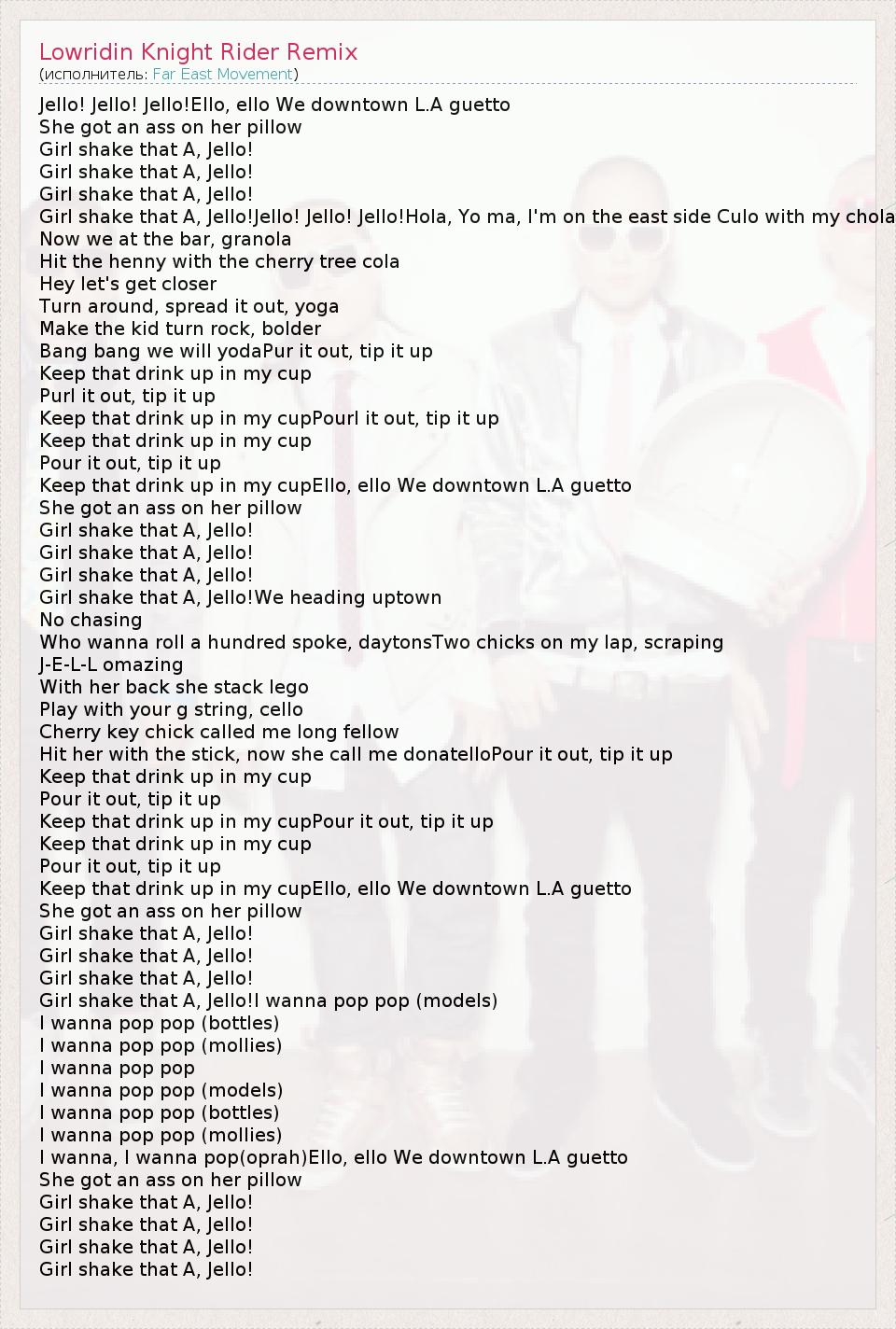 Jello! Jello! Jello!Ello, ello We downtown L.A guetto She got an ass on her pillow Girl shake that A, Jello! Girl shake that A, Jello! Girl shake that A, Jello! Girl shake that A, Jello!Jello! Jello! Jello!Hola, Yo ma, I'm on the east side Culo with my chola Now we at the bar, granola Hit the henny with the cherry tree cola Hey let's get closer Turn around, spread it out, yoga Make the kid turn rock, bolder Bang bang we will yodaPur it out, tip it up Keep that drink up in my cup Purl it out, tip it up Keep that drink up in my cupPourl it out, tip it up Keep that drink up in my cup Pour it out, tip it up Keep that drink up in my cupEllo, ello We downtown L.A guetto She got an ass on her pillow Girl shake that A, Jello! Girl shake that A, Jello! Girl shake that A, Jello! Girl shake that A, Jello!We heading uptown No chasing Who wanna roll a hundred spoke, daytonsTwo chicks on my lap, scraping J-E-L-L omazing With her back she stack lego Play with your g string, cello Cherry key chick called me long fellow Hit her with the stick, now she call me donatelloPour it out, tip it up Keep that drink up in my cup Pour it out, tip it up Keep that drink up in my cupPour it out, tip it up Keep that drink up in my cup Pour it out, tip it up Keep that drink up in my cupEllo, ello We downtown L.A guetto She got an ass on her pillow Girl shake that A, Jello! Girl shake that A, Jello! Girl shake that A, Jello! Girl shake that A, Jello!I wanna pop pop (models) I wanna pop pop (bottles) I wanna pop pop (mollies) I wanna pop pop I wanna pop pop (models) I wanna pop pop (bottles) I wanna pop pop (mollies) I wanna, I wanna pop(oprah)Ello, ello We downtown L.A guetto She got an ass on her pillow Girl shake that A, Jello! Girl shake that A, Jello! Girl shake that A, Jello! Girl shake that A, Jello!