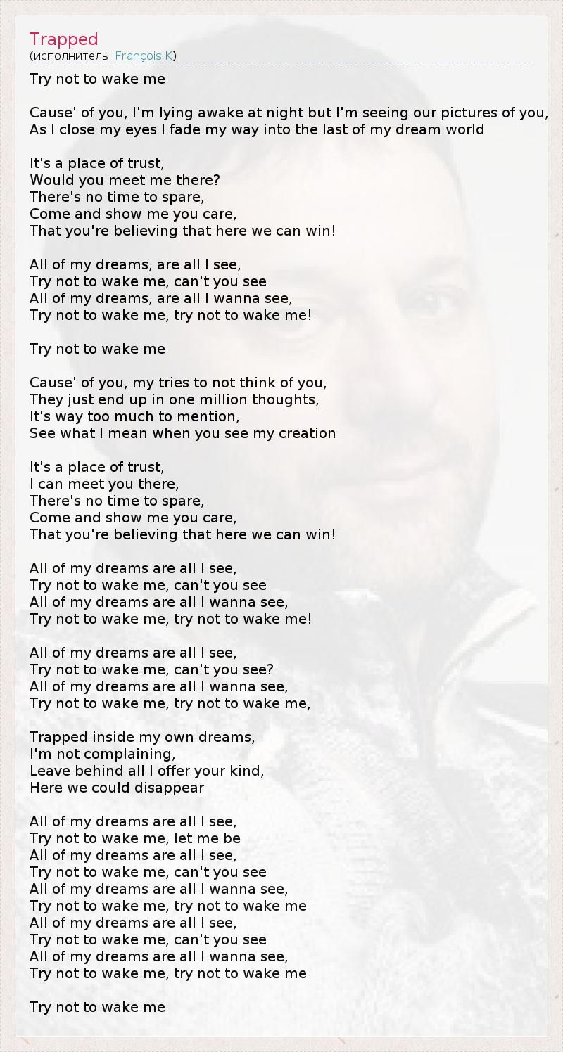 Постарайся меня не разбудить. Из-за тебя я лежу с открытыми глазами по ночам и вижу наши образы тебя, А как только я закрываю глаза, я растворяюсь в своём последнем мире грёз... Это место доверия, Не встретишься ли со мной там? Нет времени на раздумья, Просто приди и покажи мне, что тебе не всё равно, Покажи свою веру в нашу победу здесь! Все мои грёзы – это всё, что я вижу, Постарайся не разбудить меня, неужели не понимаешь? Все мои грёзы – это то, что я хочу видеть, Постарайся не разбудить меня, постарайся не разбудить меня! Постарайся не разбудить меня... Из-за тебя я стараюсь о тебе не думать, Но эти попытки заканчиваются в миллионе мыслей, Которых слишком много, чтобы о каждой упомянуть, Так что смотри, что я имею в виду, глядя на моё творение... ...Это место доверия, Я могу тебя там встретить, Нет времени на раздумья, Просто приди и покажи мне, что тебе не всё равно, Покажи свою веру в нашу победу здесь! Все мои грёзы – это всё, что я вижу, Постарайся не разбудить меня, неужели не понимаешь? Все мои грёзы – это то, что я хочу видеть, Постарайся не разбудить меня, постарайся не разбудить меня! Все мои грёзы – это всё, что я вижу, Постарайся не разбудить меня, неужели не понимаешь? Все мои грёзы – это то, что я хочу видеть, Постарайся не разбудить меня, постарайся не разбудить меня! Заточённый в своих собственных снах, Но я не сожалею об этом, Оставь позади всё, что я тебе предлагал, Здесь мы можем раствориться... Все мои грёзы – это всё, что я вижу, Постарайся не разбудить меня, оставь в покое, Все мои грёзы – это всё, что я вижу, Постарайся не разбудить меня, неужели не понимаешь? Все мои грёзы – это то, что я хочу видеть, Постарайся не разбудить меня, постарайся не разбудить меня! Все мои грёзы – это всё, что я вижу, Постарайся не разбудить меня, неужели не понимаешь? Все мои грёзы – это то, что я хочу видеть, Постарайся не разбудить меня, постарайся не разбудить меня! Постарайся не разбудить меня.