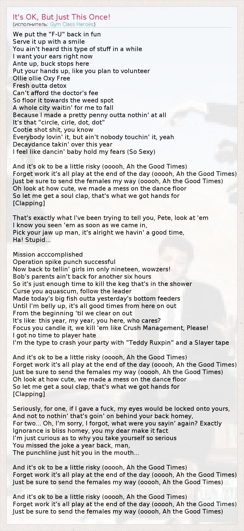 ГлавнаяИсполнителиGym Class HeroesIt's OK, But Just This Once!