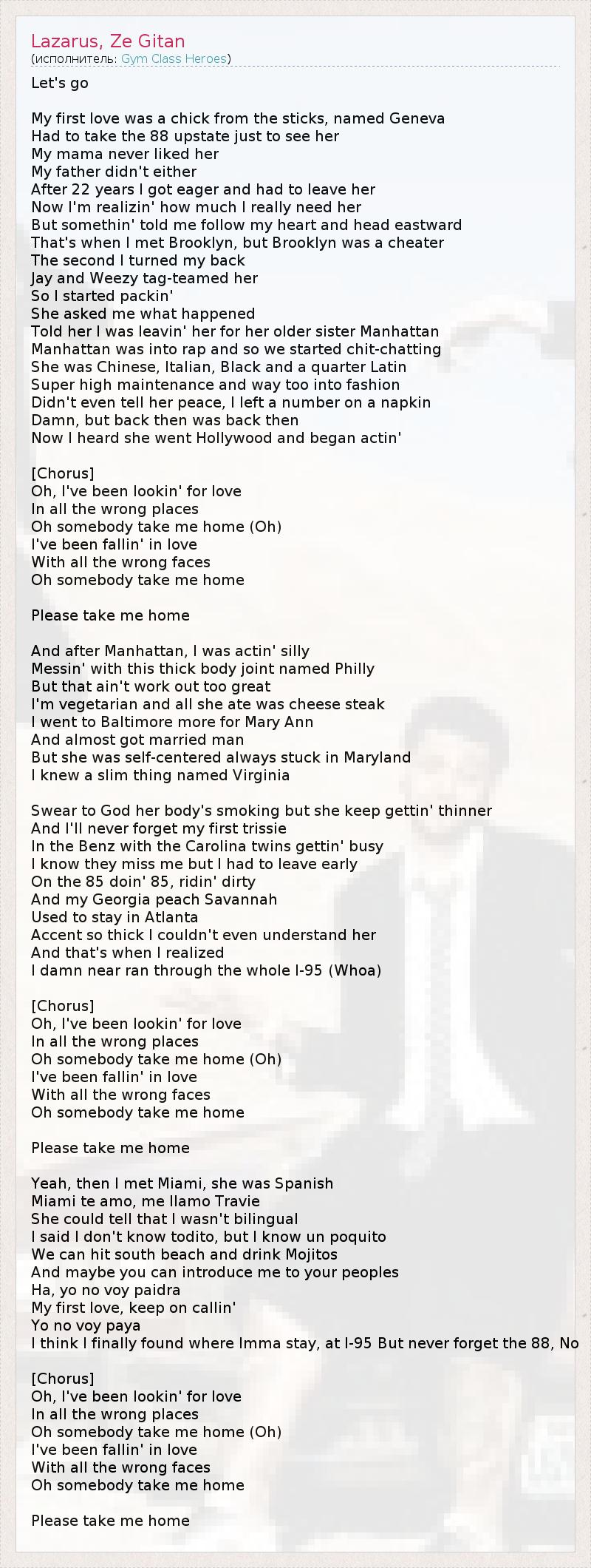 Let's go My first love was a chick from the sticks, named Geneva Had to take the 88 upstate just to see her My mama never liked her My father didn't either After 22 years I got eager and had to leave her Now I'm realizin' how much I really need her But somethin' told me follow my heart and head eastward That's when I met Brooklyn, but Brooklyn was a cheater The second I turned my back Jay and Weezy tag-teamed her So I started packin' She asked me what happened Told her I was leavin' her for her older sister Manhattan Manhattan was into rap and so we started chit-chatting She was Chinese, Italian, Black and a quarter Latin Super high maintenance and way too into fashion Didn't even tell her peace, I left a number on a napkin Damn, but back then was back then Now I heard she went Hollywood and began actin' [Chorus] Oh, I've been lookin' for love In all the wrong places Oh somebody take me home (Oh) I've been fallin' in love With all the wrong faces Oh somebody take me home Please take me home And after Manhattan, I was actin' silly Messin' with this thick body joint named Philly But that ain't work out too great I'm vegetarian and all she ate was cheese steak I went to Baltimore more for Mary Ann And almost got married man But she was self-centered always stuck in Maryland I knew a slim thing named Virginia Swear to God her body's smoking but she keep gettin' thinner And I'll never forget my first trissie In the Benz with the Carolina twins gettin' busy I know they miss me but I had to leave early On the 85 doin' 85, ridin' dirty And my Georgia peach Savannah Used to stay in Atlanta Accent so thick I couldn't even understand her And that's when I realized I damn near ran through the whole I-95 (Whoa) [Chorus] Oh, I've been lookin' for love In all the wrong places Oh somebody take me home (Oh) I've been fallin' in love With all the wrong faces Oh somebody take me home Please take me home Yeah, then I met Miami, she was Spanish Miami te amo, me llamo Travie She could tell that I wasn't bilingual I said I don't know todito, but I know un poquito We can hit south beach and drink Mojitos And maybe you can introduce me to your peoples Ha, yo no voy paidra My first love, keep on callin' Yo no voy paya I think I finally found where Imma stay, at I-95 But never forget the 88, No [Chorus] Oh, I've been lookin' for love In all the wrong places Oh somebody take me home (Oh) I've been fallin' in love With all the wrong faces Oh somebody take me home Please take me home