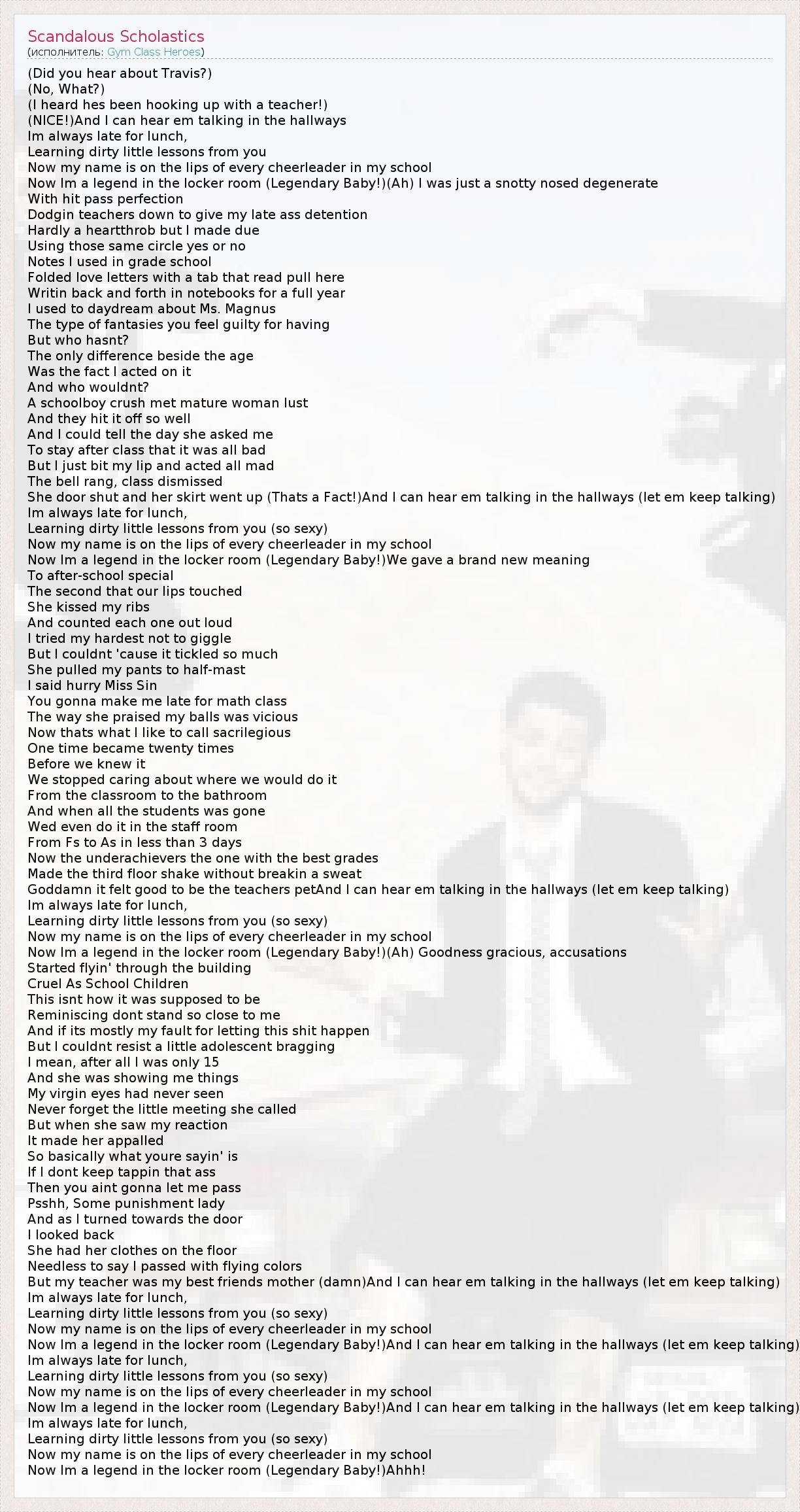 (Did you hear about Travis?) (No, What?) (I heard hes been hooking up with a teacher!) (NICE!)And I can hear em talking in the hallways Im always late for lunch, Learning dirty little lessons from you Now my name is on the lips of every cheerleader in my school Now Im a legend in the locker room (Legendary Baby!)(Ah) I was just a snotty nosed degenerate With hit pass perfection Dodgin teachers down to give my late ass detention Hardly a heartthrob but I made due Using those same circle yes or no Notes I used in grade school Folded love letters with a tab that read pull here Writin back and forth in notebooks for a full year I used to daydream about Ms. Magnus The type of fantasies you feel guilty for having But who hasnt? The only difference beside the age Was the fact I acted on it And who wouldnt? A schoolboy crush met mature woman lust And they hit it off so well And I could tell the day she asked me To stay after class that it was all bad But I just bit my lip and acted all mad The bell rang, class dismissed She door shut and her skirt went up (Thats a Fact!)And I can hear em talking in the hallways (let em keep talking) Im always late for lunch, Learning dirty little lessons from you (so sexy) Now my name is on the lips of every cheerleader in my school Now Im a legend in the locker room (Legendary Baby!)We gave a brand new meaning To after-school special The second that our lips touched She kissed my ribs And counted each one out loud I tried my hardest not to giggle But I couldnt 'cause it tickled so much She pulled my pants to half-mast I said hurry Miss Sin You gonna make me late for math class The way she praised my balls was vicious Now thats what I like to call sacrilegious One time became twenty times Before we knew it We stopped caring about where we would do it From the classroom to the bathroom And when all the students was gone Wed even do it in the staff room From Fs to As in less than 3 days Now the underachievers the one with the best grades Made the third floor shake without breakin a sweat Goddamn it felt good to be the teachers petAnd I can hear em talking in the hallways (let em keep talking) Im always late for lunch, Learning dirty little lessons from you (so sexy) Now my name is on the lips of every cheerleader in my school Now Im a legend in the locker room (Legendary Baby!)(Ah) Goodness gracious, accusations Started flyin' through the building Cruel As School Children This isnt how it was supposed to be Reminiscing dont stand so close to me And if its mostly my fault for letting this shit happen But I couldnt resist a little adolescent bragging I mean, after all I was only 15 And she was showing me things My virgin eyes had never seen Never forget the little meeting she called But when she saw my reaction It made her appalled So basically what youre sayin' is If I dont keep tappin that ass Then you aint gonna let me pass Psshh, Some punishment lady And as I turned towards the door I looked back She had her clothes on the floor Needless to say I passed with flying colors But my teacher was my best friends mother (damn)And I can hear em talking in the hallways (let em keep talking) Im always late for lunch, Learning dirty little lessons from you (so sexy) Now my name is on the lips of every cheerleader in my school Now Im a legend in the locker room (Legendary Baby!)And I can hear em talking in the hallways (let em keep talking) Im always late for lunch, Learning dirty little lessons from you (so sexy) Now my name is on the lips of every cheerleader in my school Now Im a legend in the locker room (Legendary Baby!)And I can hear em talking in the hallways (let em keep talking) Im always late for lunch, Learning dirty little lessons from you (so sexy) Now my name is on the lips of every cheerleader in my school Now Im a legend in the locker room (Legendary Baby!)Ahhh!