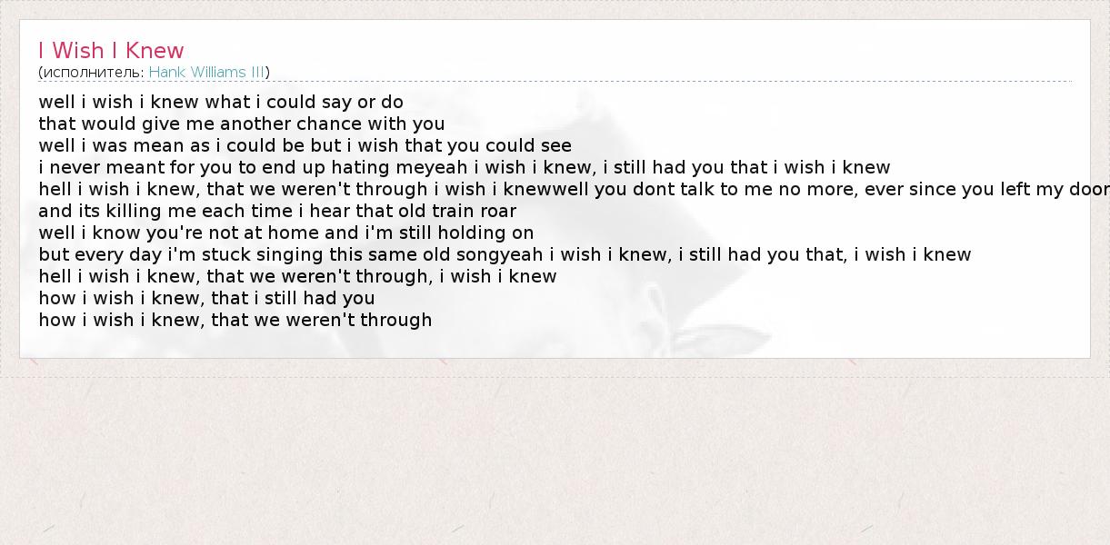 well i wish i knew what i could say or do that would give me another chance with you well i was mean as i could be but i wish that you could see i never meant for you to end up hating meyeah i wish i knew, i still had you that i wish i knew hell i wish i knew, that we weren't through i wish i knewwell you dont talk to me no more, ever since you left my door and its killing me each time i hear that old train roar well i know you're not at home and i'm still holding on but every day i'm stuck singing this same old songyeah i wish i knew, i still had you that, i wish i knew hell i wish i knew, that we weren't through, i wish i knew how i wish i knew, that i still had you how i wish i knew, that we weren't through