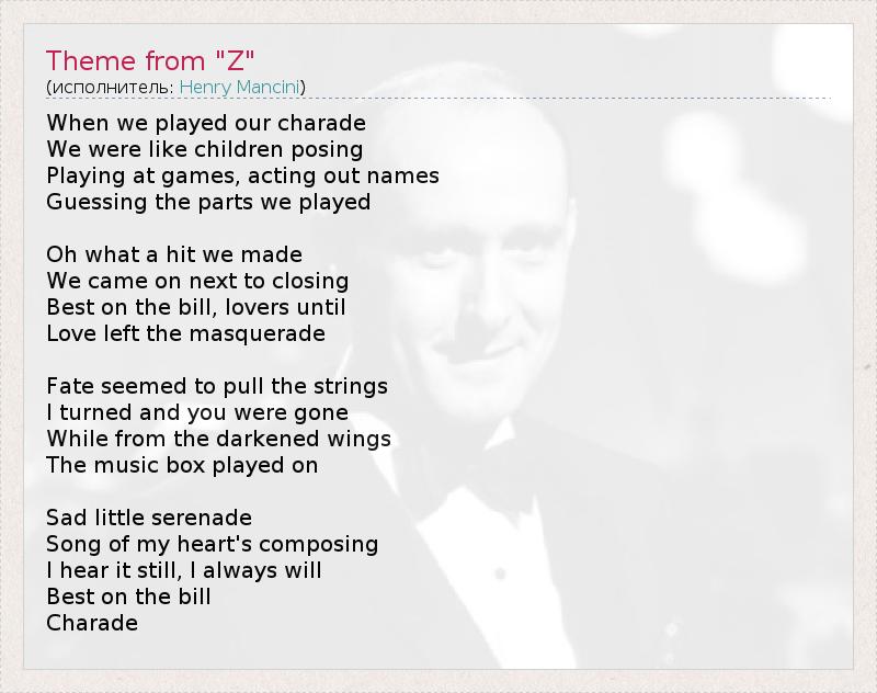 Это интересно:Генри Манчини (англ. Henry Mancini, псевдоним; настоящее имя — Энрико Никола Манчини, англ. Enrico Nicola Mancini; 16 апреля 1924, Кливленд, штат Огайо — 14 июня 1994, Беверли Хиллз, штат Калифорния) — знаменитый американский дирижёр и кинокомпозитор. Написал музыку почти к 500 фильмам и телесериалам, выпустил 50 альбомов, получил за свою музыку 4 премии «Оскар», 2 «Эмми» и целых 20 «Грэмми», включая награду «За жизненный... продолжение