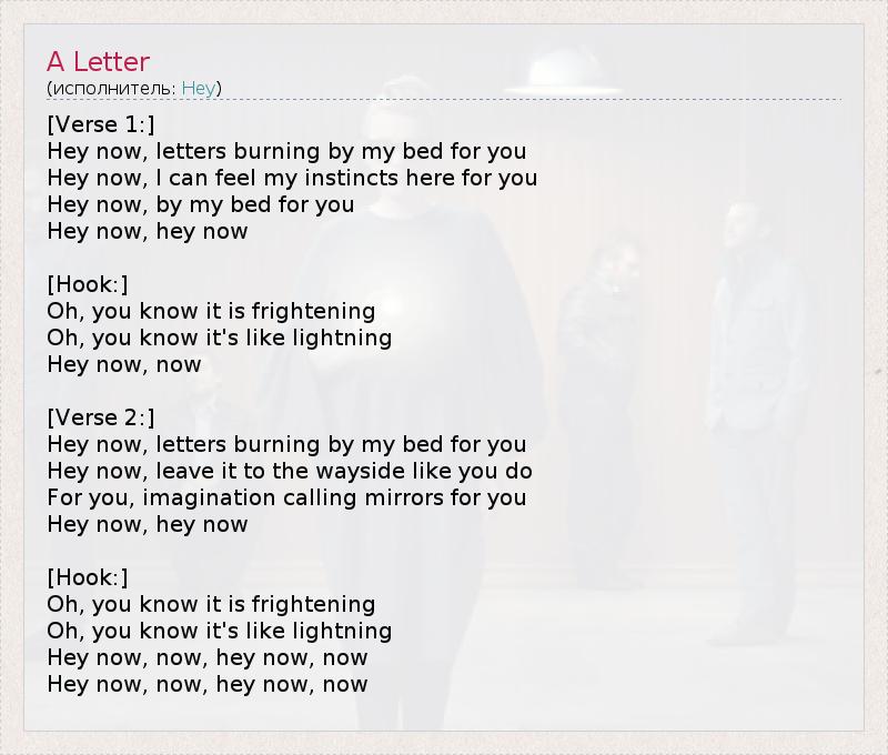 [Verse 1:] Hey now, letters burning by my bed for you Hey now, I can feel my instincts here for you Hey now, by my bed for you Hey now, hey now [Hook:] Oh, you know it is frightening Oh, you know it's like lightning Hey now, now [Verse 2:] Hey now, letters burning by my bed for you Hey now, leave it to the wayside like you do For you, imagination calling mirrors for you Hey now, hey now [Hook:] Oh, you know it is frightening Oh, you know it's like lightning Hey now, now, hey now, now Hey now, now, hey now, now