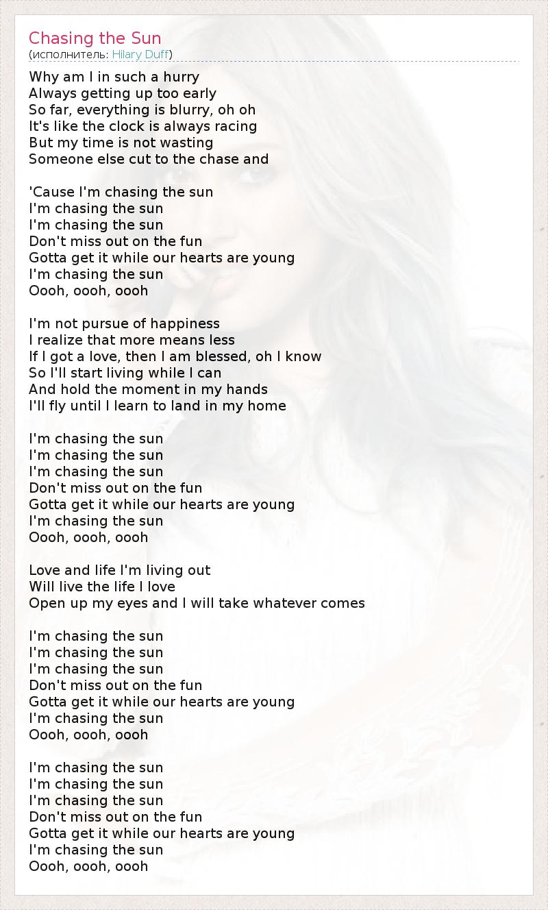 Why am I in such a hurry Always getting up too early So far, everything is blurry, oh oh It's like the clock is always racing But my time is not wasting Someone else cut to the chase and 'Cause I'm chasing the sun I'm chasing the sun I'm chasing the sun Don't miss out on the fun Gotta get it while our hearts are young I'm chasing the sun Oooh, oooh, oooh I'm not pursue of happiness I realize that more means less If I got a love, then I am blessed, oh I know So I'll start living while I can And hold the moment in my hands I'll fly until I learn to land in my home I'm chasing the sun I'm chasing the sun I'm chasing the sun Don't miss out on the fun Gotta get it while our hearts are young I'm chasing the sun Oooh, oooh, oooh Love and life I'm living out Will live the life I love Open up my eyes and I will take whatever comes I'm chasing the sun I'm chasing the sun I'm chasing the sun Don't miss out on the fun Gotta get it while our hearts are young I'm chasing the sun Oooh, oooh, oooh I'm chasing the sun I'm chasing the sun I'm chasing the sun Don't miss out on the fun Gotta get it while our hearts are young I'm chasing the sun Oooh, oooh, oooh