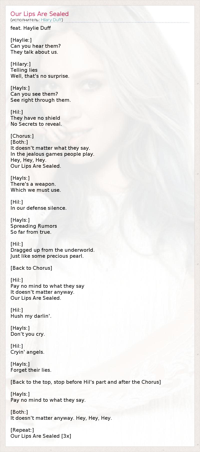 feat. Haylie Duff [Haylie:] Can you hear them? They talk about us. [Hilary:] Telling lies Well, that's no surprise. [Hayls:] Can you see them? See right through them. [Hil:] They have no shield No Secrets to reveal. [Chorus:] [Both:] It doesn't matter what they say. In the jealous games people play. Hey, Hey, Hey. Our Lips Are Sealed. [Hayls:] There's a weapon. Which we must use. [Hil:] In our defense silence. [Hayls:] Spreading Rumors So far from true. [Hil:] Dragged up from the underworld. Just like some precious pearl. [Back to Chorus] [Hil:] Pay no mind to what they say It doesn't matter anyway. Our Lips Are Sealed. [Hil:] Hush my darlin'. [Hayls:] Don't you cry. [Hil:] Cryin' angels. [Hayls:] Forget their lies. [Back to the top, stop before Hil's part and after the Chorus] [Hayls:] Pay no mind to what they say. [Both:] It doesn't matter anyway. Hey, Hey, Hey. [Repeat:] Our Lips Are Sealed [3x]