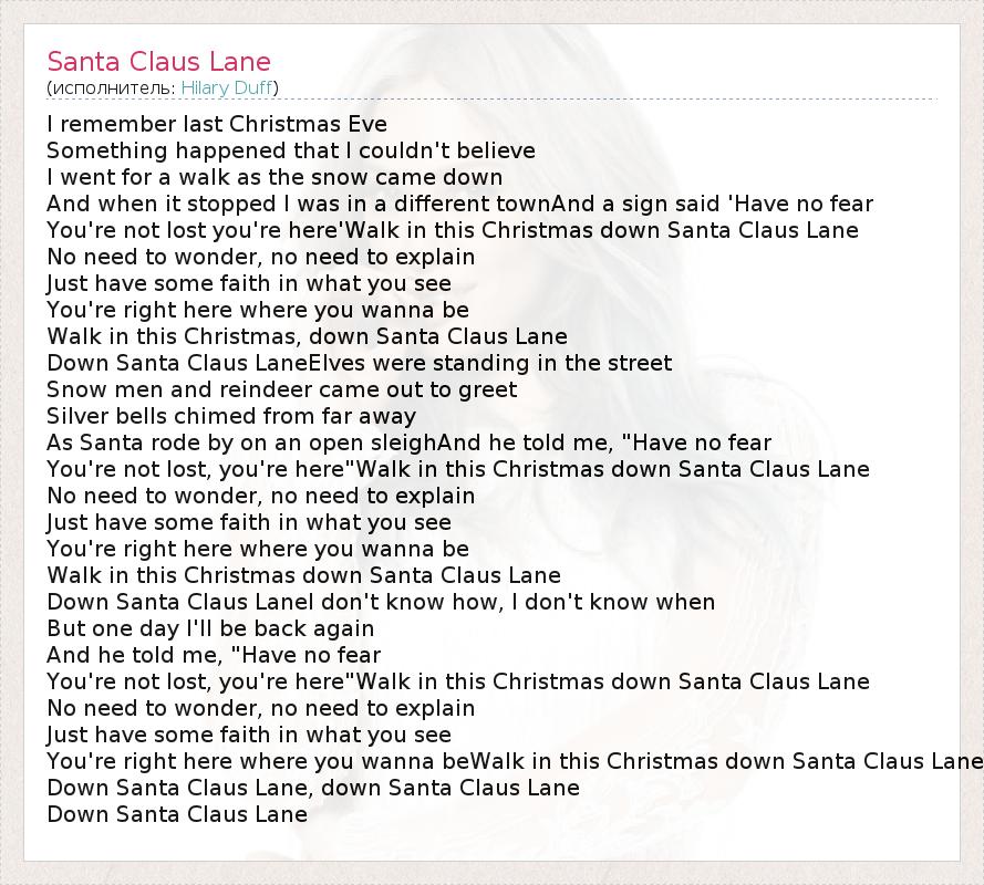 I remember last Christmas Eve Something happened that I couldn't believe I went for a walk as the snow came down And when it stopped I was in a different townAnd a sign said 'Have no fear You're not lost you're here'Walk in this Christmas down Santa Claus Lane No need to wonder, no need to explain Just have some faith in what you see You're right here where you wanna be Walk in this Christmas, down Santa Claus Lane Down Santa Claus LaneElves were standing in the street Snow men and reindeer came out to greet Silver bells chimed from far away As Santa rode by on an open sleighAnd he told me, "Have no fear You're not lost, you're here"Walk in this Christmas down Santa Claus Lane No need to wonder, no need to explain Just have some faith in what you see You're right here where you wanna be Walk in this Christmas down Santa Claus Lane Down Santa Claus LaneI don't know how, I don't know when But one day I'll be back again And he told me, "Have no fear You're not lost, you're here"Walk in this Christmas down Santa Claus Lane No need to wonder, no need to explain Just have some faith in what you see You're right here where you wanna beWalk in this Christmas down Santa Claus Lane Down Santa Claus Lane, down Santa Claus Lane Down Santa Claus Lane