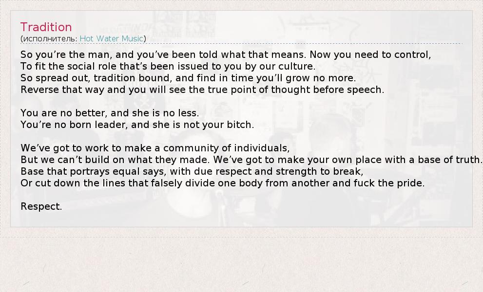 Это интересно:Hot Water MusicМестонахождение: Гэйнсвилль, штат Флорида (США).Лэйблы: Epitaph, No Idea RecordsУчастники: Чак Рэгэн (Chuck Ragan), Крис Уоллард (Chris Wollard), Джейсон Блэк (Jason Black), и Джордж Ребело (George Rebelo).Hot Water Music - это панк рок/пост-хардкор группа из Гэйнсвилля, Флорида. Участниками группы являются Чак Рэгэн (Chuck Ragan), Крис... продолжение