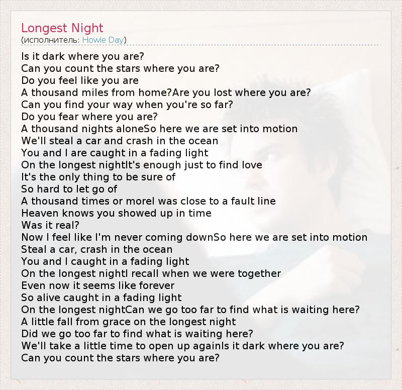 Is it dark where you are? Can you count the stars where you are? Do you feel like you are A thousand miles from home?Are you lost where you are? Can you find your way when you're so far? Do you fear where you are? A thousand nights aloneSo here we are set into motion We'll steal a car and crash in the ocean You and I are caught in a fading light On the longest nightIt's enough just to find love It's the only thing to be sure of So hard to let go of A thousand times or moreI was close to a fault line Heaven knows you showed up in time Was it real? Now I feel like I'm never coming downSo here we are set into motion Steal a car, crash in the ocean You and I caught in a fading light On the longest nightI recall when we were together Even now it seems like forever So alive caught in a fading light On the longest nightCan we go too far to find what is waiting here? A little fall from grace on the longest night Did we go too far to find what is waiting here? We'll take a little time to open up againIs it dark where you are? Can you count the stars where you are?