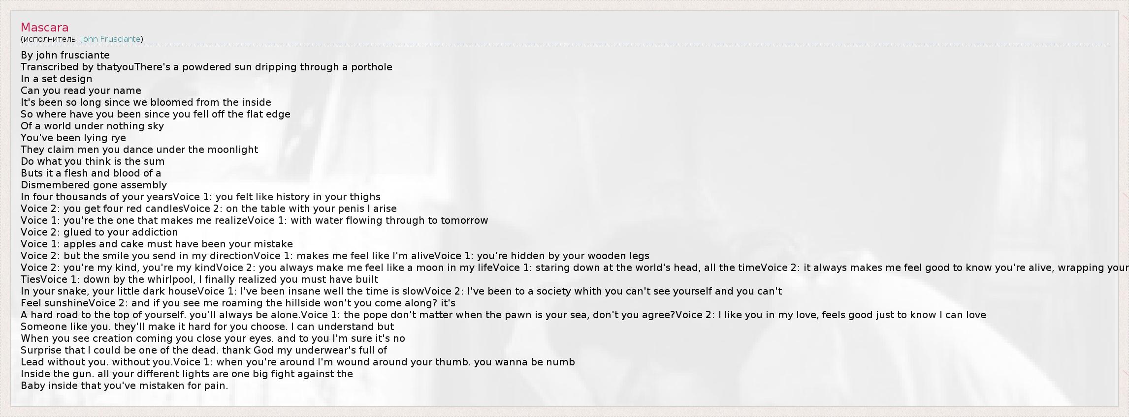 Это интересно:Джон Фрушанте младший родился 5 марта 1970 года в Нью-Йорке. Он рос в хорошей семье, у него были любящие родители, два брата и две сестры. В 13 лет дедушка дарит Джону гитару и отдает его на курсы классический гитары. С этих пор и начинается увлечение Джона музыкой. В 16 лет Джон уходит из дома и снимает квартиру. Он проводил дни, играя на гитаре под записи Джимми Хендрикса, Френка Заппы, Эрика... продолжение