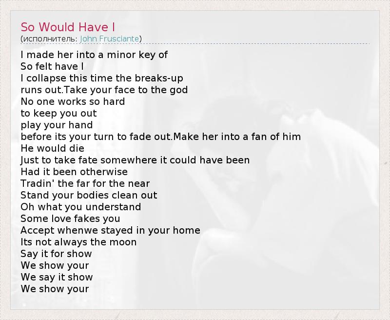 I made her into a minor key of So felt have I I collapse this time the breaks-up runs out.Take your face to the god No one works so hard to keep you out play your hand before its your turn to fade out.Make her into a fan of him He would die Just to take fate somewhere it could have been Had it been otherwise Tradin' the far for the near Stand your bodies clean out Oh what you understand Some love fakes you Accept whenwe stayed in your home Its not always the moon Say it for show We show your We say it show We show your