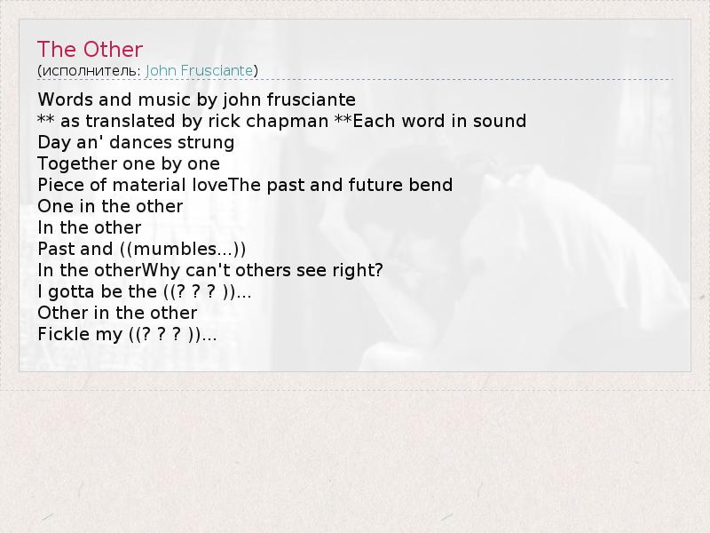 Это интересно:Джон Фрушанте младший родился 5 марта 1970 года в Нью-Йорке. Он рос в хорошей семье, у него были любящие родители, два брата и две сестры. В 13 лет дедушка дарит Джону гитару и отдает его на курсы классический гитары. С этих пор и начинается увлечение Джона музыкой. В 16 лет Джон уходит из дома и снимает квартиру. Он проводил дни, играя на гитаре под записи Джимми Хендрикса, Френка Заппы, Эрика... продолжение
