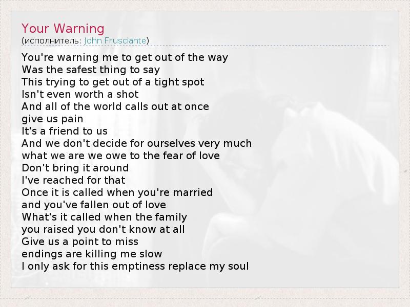 You're warning me to get out of the way Was the safest thing to say This trying to get out of a tight spot Isn't even worth a shot And all of the world calls out at once give us pain It's a friend to us And we don't decide for ourselves very much what we are we owe to the fear of love Don't bring it around I've reached for that Once it is called when you're married and you've fallen out of love What's it called when the family you raised you don't know at all Give us a point to miss endings are killing me slow I only ask for this emptiness replace my soul