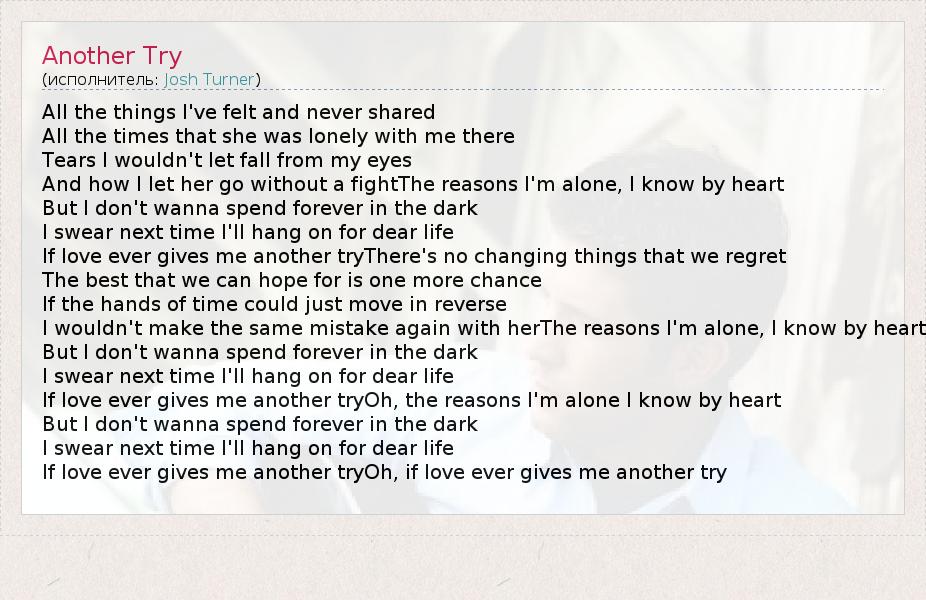 If love ever gives me another tryOh, the reasons I'm alone I know by heart