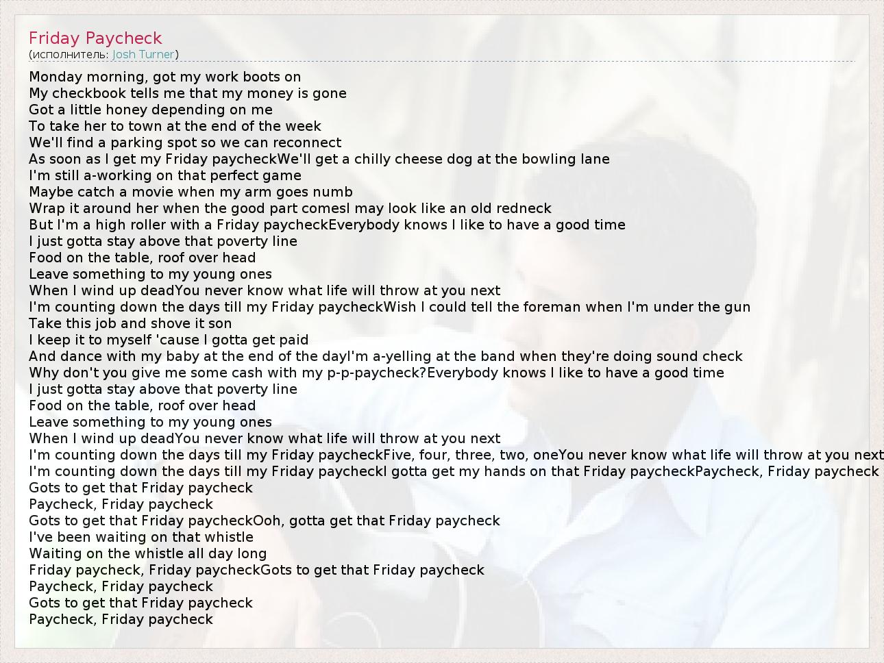 А как ты думаешь, о чем песня "Friday Paycheck" ?