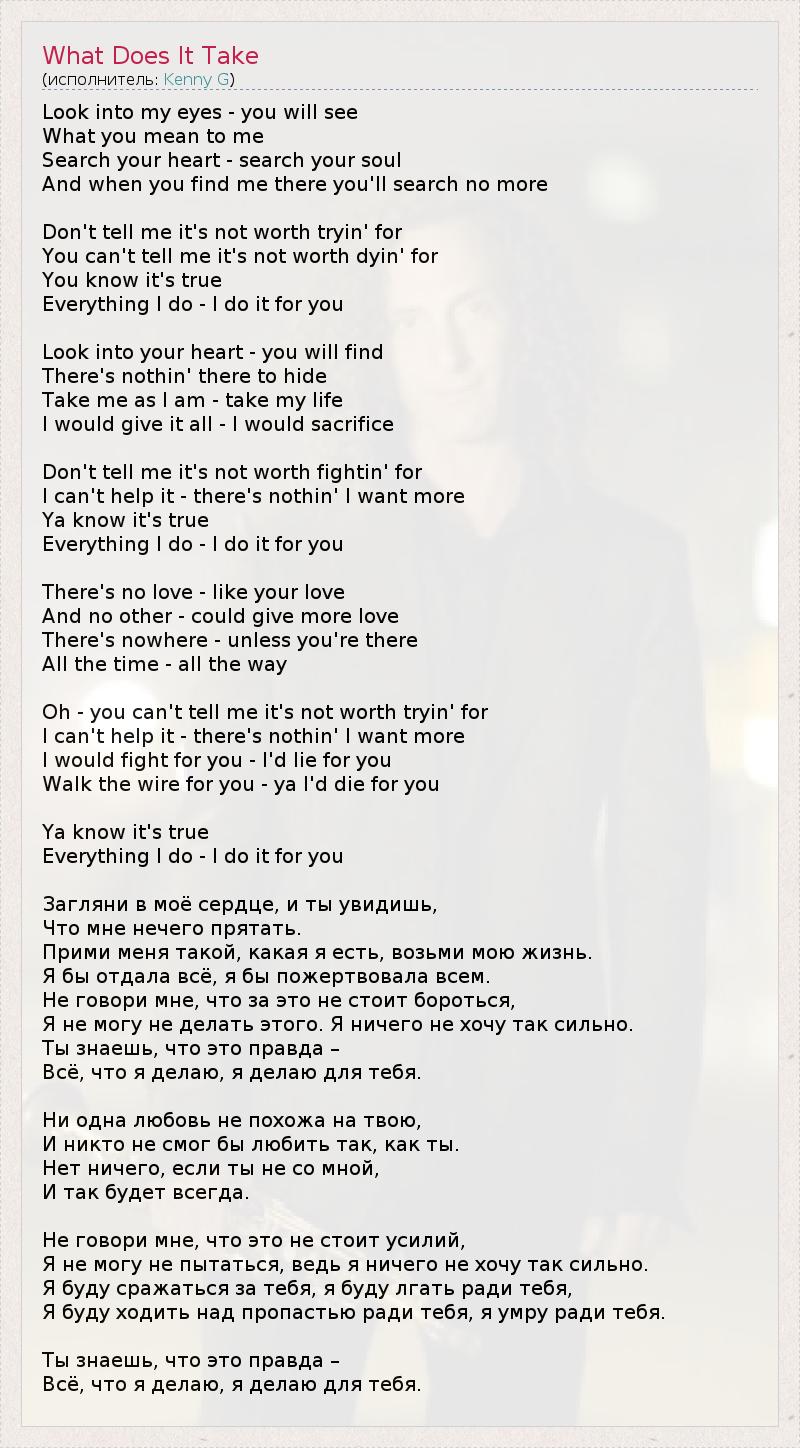 Look into my eyes - you will see What you mean to me Search your heart - search your soul And when you find me there you'll search no more Don't tell me it's not worth tryin' for You can't tell me it's not worth dyin' for You know it's true Everything I do - I do it for you Look into your heart - you will find There's nothin' there to hide Take me as I am - take my life I would give it all - I would sacrifice Don't tell me it's not worth fightin' for I can't help it - there's nothin' I want more Ya know it's true Everything I do - I do it for you There's no love - like your love And no other - could give more love There's nowhere - unless you're there All the time - all the way Oh - you can't tell me it's not worth tryin' for I can't help it - there's nothin' I want more I would fight for you - I'd lie for you Walk the wire for you - ya I'd die for you Ya know it's true Everything I do - I do it for you Загляни в моё сердце, и ты увидишь, Что мне нечего прятать. Прими меня такой, какая я есть, возьми мою жизнь. Я бы отдала всё, я бы пожертвовала всем. Не говори мне, что за это не стоит бороться, Я не могу не делать этого. Я ничего не хочу так сильно. Ты знаешь, что это правда – Всё, что я делаю, я делаю для тебя. Ни одна любовь не похожа на твою, И никто не смог бы любить так, как ты. Нет ничего, если ты не со мной, И так будет всегда. Не говори мне, что это не стоит усилий, Я не могу не пытаться, ведь я ничего не хочу так сильно. Я буду сражаться за тебя, я буду лгать ради тебя, Я буду ходить над пропастью ради тебя, я умру ради тебя. Ты знаешь, что это правда – Всё, что я делаю, я делаю для тебя.