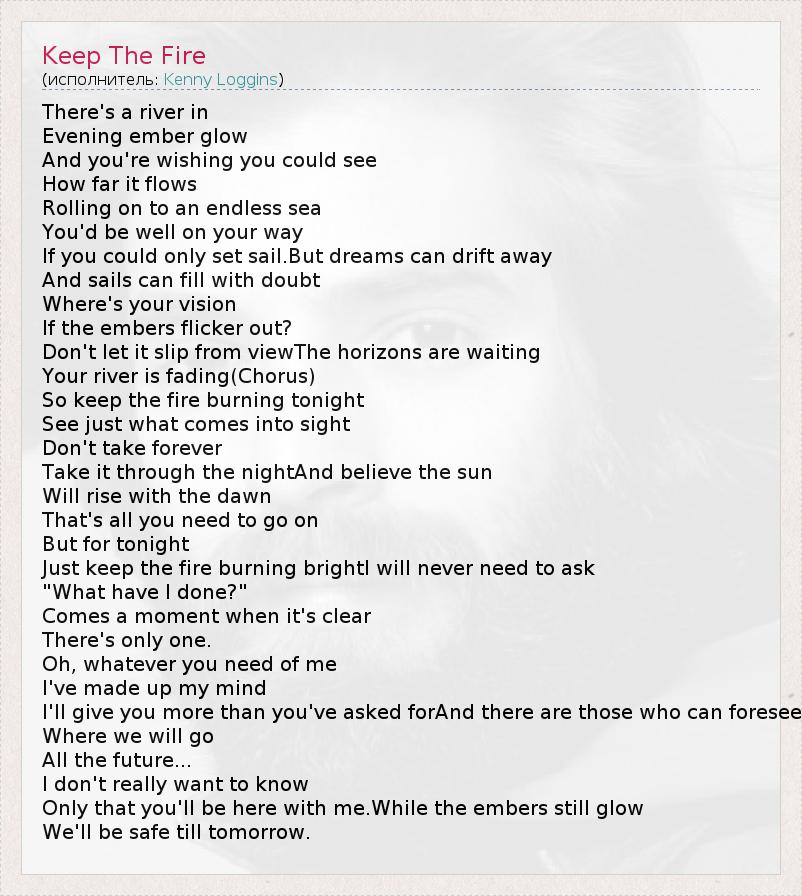 There's a river in Evening ember glow And you're wishing you could see How far it flows Rolling on to an endless sea You'd be well on your way If you could only set sail.But dreams can drift away And sails can fill with doubt Where's your vision If the embers flicker out? Don't let it slip from viewThe horizons are waiting Your river is fading(Chorus) So keep the fire burning tonight See just what comes into sight Don't take forever Take it through the nightAnd believe the sun Will rise with the dawn That's all you need to go on But for tonight Just keep the fire burning brightI will never need to ask "What have I done?" Comes a moment when it's clear There's only one. Oh, whatever you need of me I've made up my mind I'll give you more than you've asked forAnd there are those who can foresee Where we will go All the future... I don't really want to know Only that you'll be here with me.While the embers still glow We'll be safe till tomorrow.