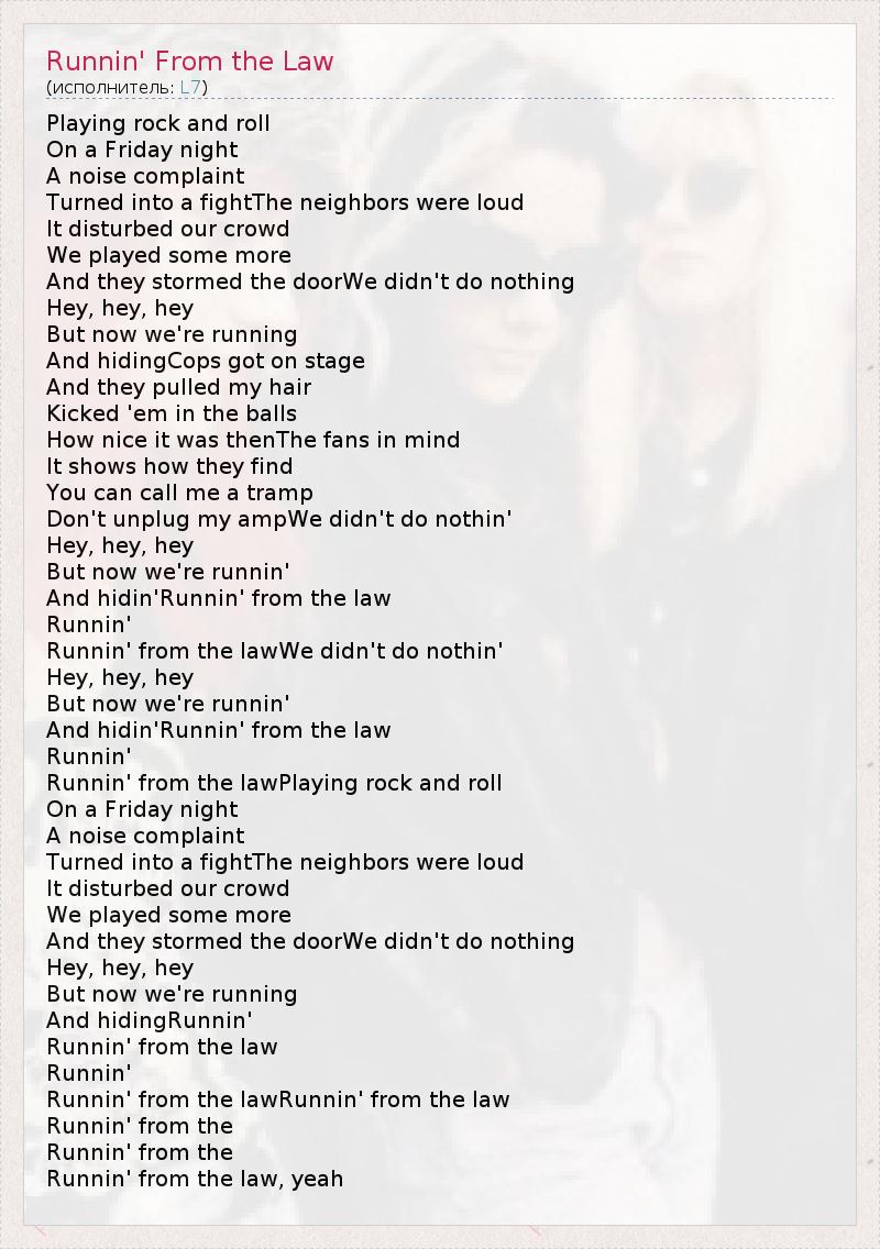 Playing rock and roll On a Friday night A noise complaint Turned into a fightThe neighbors were loud It disturbed our crowd We played some more And they stormed the doorWe didn't do nothing Hey, hey, hey But now we're running And hidingCops got on stage And they pulled my hair Kicked 'em in the balls How nice it was thenThe fans in mind It shows how they find You can call me a tramp Don't unplug my ampWe didn't do nothin' Hey, hey, hey But now we're runnin' And hidin'Runnin' from the law Runnin' Runnin' from the lawWe didn't do nothin' Hey, hey, hey But now we're runnin' And hidin'Runnin' from the law Runnin' Runnin' from the lawPlaying rock and roll On a Friday night A noise complaint Turned into a fightThe neighbors were loud It disturbed our crowd We played some more And they stormed the doorWe didn't do nothing Hey, hey, hey But now we're running And hidingRunnin' Runnin' from the law Runnin' Runnin' from the lawRunnin' from the law Runnin' from the Runnin' from the Runnin' from the law, yeah