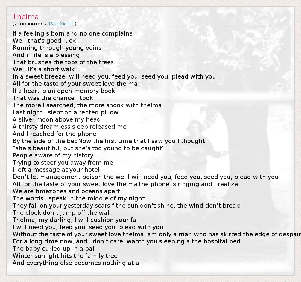 In a sweet breezeI will need you, feed you, seed you, plead with you