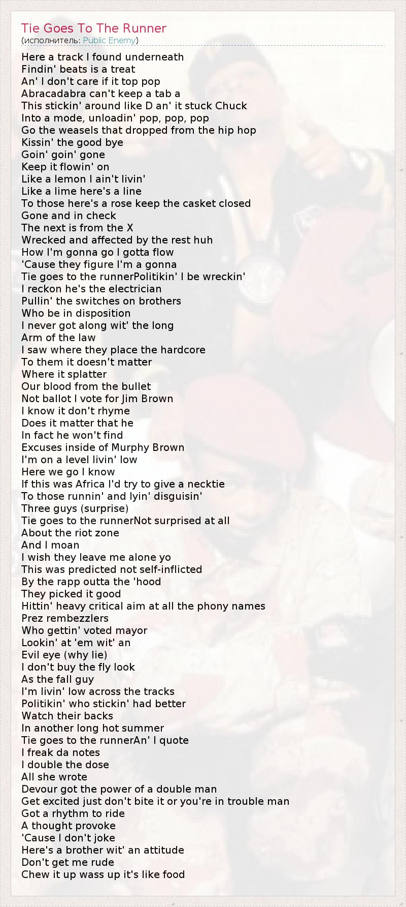 А как ты думаешь, о чем песня "Tie Goes To The Runner" ?