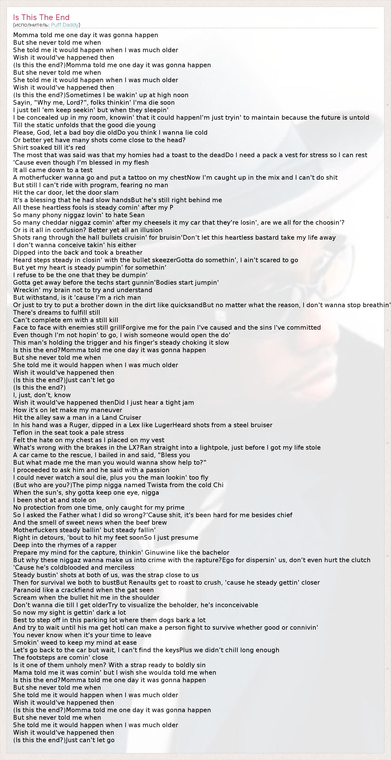 Momma told me one day it was gonna happen But she never told me when She told me it would happen when I was much older Wish it would've happened then (Is this the end?)Momma told me one day it was gonna happen But she never told me when She told me it would happen when I was much older Wish it would've happened then (Is this the end?)Sometimes I be wakin' up at high noon Sayin, "Why me, Lord?", folks thinkin' I'ma die soon I just tell 'em keep seekin' but when they sleepin' I be concealed up in my room, knowin' that it could happenI'm just tryin' to maintain because the future is untold Till the static unfolds that the good die young Please, God, let a bad boy die oldDo you think I wanna lie cold Or better yet have many shots come close to the head? Shirt soaked till it's red The most that was said was that my homies had a toast to the deadDo I need a pack a vest for stress so I can rest 'Cause even though I'm blessed in my flesh It all came down to a test A motherfucker wanna go and put a tattoo on my chestNow I'm caught up in the mix and I can't do shit But still I can't ride with program, fearing no man Hit the car door, let the door slam It's a blessing that he had slow handsBut he's still right behind me All these heartless fools is steady comin' after my P So many phony niggaz lovin' to hate Sean So many cheddar niggaz comin' after my cheeseIs it my car that they're losin', are we all for the choosin'? Or is it all in confusion? Better yet all an illusion Shots rang through the hall bullets cruisin' for bruisin'Don't let this heartless bastard take my life away I don't wanna conceive takin' his either Dipped into the back and took a breather Heard steps steady in closin' with the bullet skeezerGotta do somethin', I ain't scared to go But yet my heart is steady pumpin' for somethin' I refuse to be the one that they be dumpin' Gotta get away before the techs start gunnin'Bodies start jumpin' Wreckin' my brain not to try and understand But withstand, is it 'cause I'm a rich man Or just to try to put a brother down in the dirt like quicksandBut no matter what the reason, I don't wanna stop breathin' There's dreams to fulfill still Can't complete em with a still kill Face to face with enemies still grillForgive me for the pain I've caused and the sins I've committed Even though I'm not hopin' to go, I wish someone would open the do' This man's holding the trigger and his finger's steady choking it slow Is this the end?Momma told me one day it was gonna happen But she never told me when She told me it would happen when I was much older Wish it would've happened then (Is this the end?)Just can't let go (Is this the end?) I, just, don't, know Wish it would've happened thenDid I just hear a tight jam How it's on let make my maneuver Hit the alley saw a man in a Land Cruiser In his hand was a Ruger, dipped in a Lex like LugerHeard shots from a steel bruiser Teflon in the seat took a pale stress Felt the hate on my chest as I placed on my vest What's wrong with the brakes in the LX?Ran straight into a lightpole, just before I got my life stole A car came to the rescue, I bailed in and said, "Bless you But what made me the man you would wanna show help to?" I proceeded to ask him and he said with a passion I could never watch a soul die, plus you the man lookin' too fly (But who are you?)The pimp nigga named Twista from the cold Chi When the sun's, shy gotta keep one eye, nigga I been shot at and stole on No protection from one time, only caught for my prime So I asked the Father what I did so wrong?'Cause shit, it's been hard for me besides chief And the smell of sweet news when the beef brew Motherfuckers steady ballin' but steady fallin' Right in detours, 'bout to hit my feet soonSo I just presume Deep into the rhymes of a rapper Prepare my mind for the capture, thinkin' Ginuwine like the bachelor But why these niggaz wanna make us into crime with the rapture?Ego for dispersin' us, don't even hurt the clutch 'Cause he's coldblooded and merciless Steady bustin' shots at both of us, was the strap close to us Then for survival we both to bustBut Renaults get to roast to crush, 'cause he steady gettin' closer Paranoid like a crackfiend when the gat seen Scream when the bullet hit me in the shoulder Don't wanna die till I get olderTry to visualize the beholder, he's inconceivable So now my sight is gettin' dark a lot Best to step off in this parking lot where them dogs bark a lot And try to wait until his ma get hotI can make a person fight to survive whether good or connivin' You never know when it's your time to leave Smokin' weed to keep my mind at ease Let's go back to the car but wait, I can't find the keysPlus we didn't chill long enough The footsteps are comin' close Is it one of them unholy men? With a strap ready to boldly sin Mama told me it was comin' but I wish she woulda told me when Is this the end?Momma told me one day it was gonna happen But she never told me when She told me it would happen when I was much older Wish it would've happened then (Is this the end?)Momma told me one day it was gonna happen But she never told me when She told me it would happen when I was much older Wish it would've happened then (Is this the end?)Just can't let go