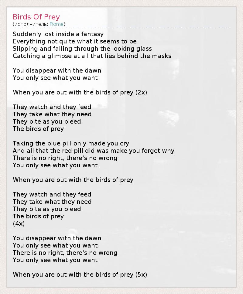 Ты неожиданно потерялся в иллюзии, Все не то, чем кажется. Скользишь и проваливаешься сквозь зеркало, Бросаешь взгляд на всё, что скрыто под масками. Ты исчезаешь с рассветом, Ты видишь только то, что хочешь увидеть, Когда ты противостоишь хищным птицам. (2 раза) Они высматривают, и они поедают, Они забирают то, что им нужно, Они клюют, пока ты истекаешь кровью, Хищные птицы. Приняв синюю пилюлю, ты стал кричать, А красная пилюля заставила тебя забыть почему. Нет ничего правильного и неправильного, Ты видишь только то, что хочешь увидеть, Когда ты противостоишь хищным птицам. Они высматривают, и они поедают, Они забирают то, что им нужно, Они клюют, пока ты истекаешь кровью, Хищные птицы. (4 раза) Ты исчезаешь с рассветом, Ты видишь только то, что хочешь увидеть. Нет ничего правильного и неправильного, Ты видишь только то, что хочешь увидеть, Когда ты противостоишь хищным птицам. (5 раз)