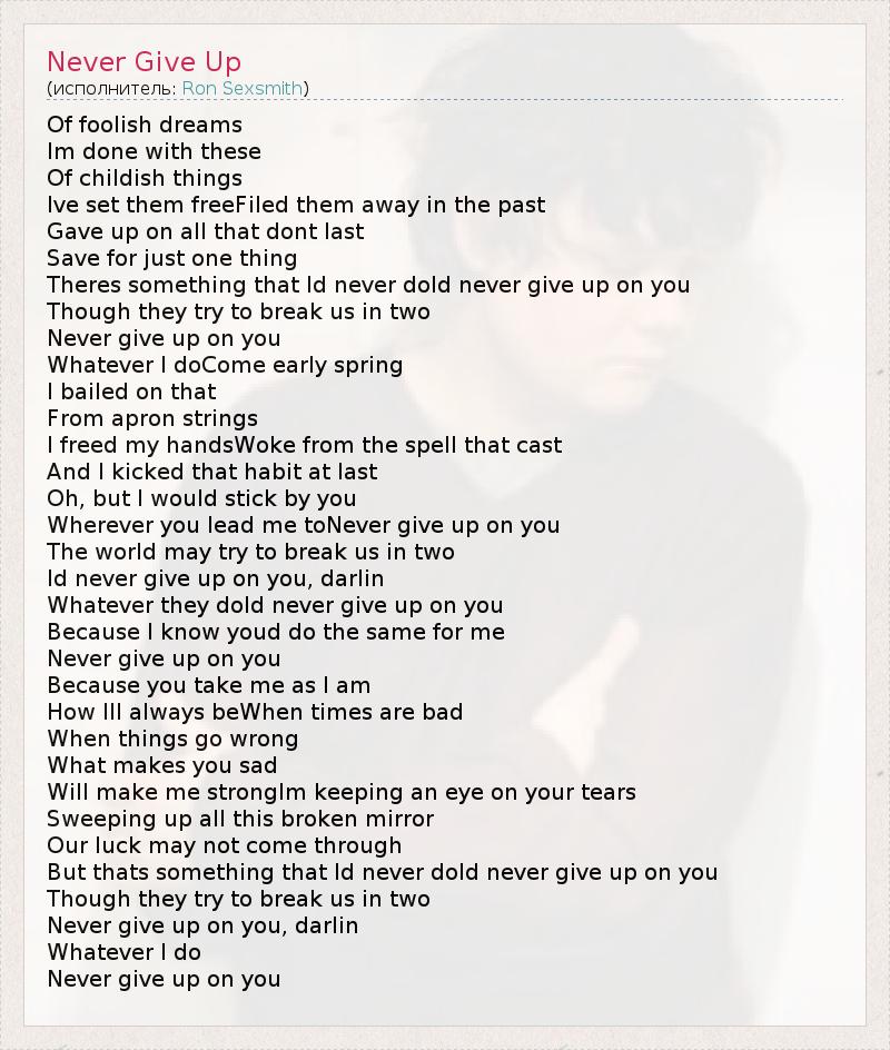 Of foolish dreams Im done with these Of childish things Ive set them freeFiled them away in the past Gave up on all that dont last Save for just one thing Theres something that Id never doId never give up on you Though they try to break us in two Never give up on you Whatever I doCome early spring I bailed on that From apron strings I freed my handsWoke from the spell that cast And I kicked that habit at last Oh, but I would stick by you Wherever you lead me toNever give up on you The world may try to break us in two Id never give up on you, darlin Whatever they doId never give up on you Because I know youd do the same for me Never give up on you Because you take me as I am How Ill always beWhen times are bad When things go wrong What makes you sad Will make me strongIm keeping an eye on your tears Sweeping up all this broken mirror Our luck may not come through But thats something that Id never doId never give up on you Though they try to break us in two Never give up on you, darlin Whatever I do Never give up on you