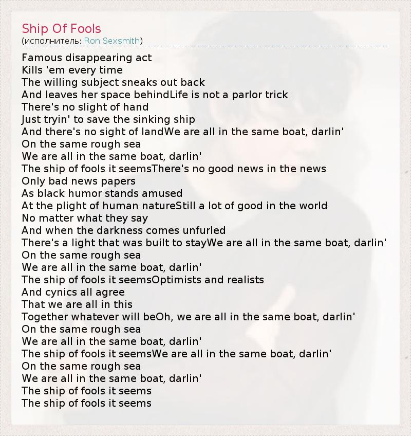 Famous disappearing act Kills 'em every time The willing subject sneaks out back And leaves her space behindLife is not a parlor trick There's no slight of hand Just tryin' to save the sinking ship And there's no sight of landWe are all in the same boat, darlin' On the same rough sea We are all in the same boat, darlin' The ship of fools it seemsThere's no good news in the news Only bad news papers As black humor stands amused At the plight of human natureStill a lot of good in the world No matter what they say And when the darkness comes unfurled There's a light that was built to stayWe are all in the same boat, darlin' On the same rough sea We are all in the same boat, darlin' The ship of fools it seemsOptimists and realists And cynics all agree That we are all in this Together whatever will beOh, we are all in the same boat, darlin' On the same rough sea We are all in the same boat, darlin' The ship of fools it seemsWe are all in the same boat, darlin' On the same rough sea We are all in the same boat, darlin' The ship of fools it seems The ship of fools it seems