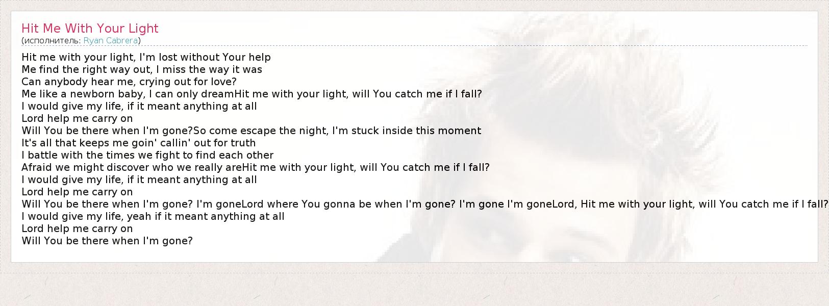 Hit me with your light, I'm lost without Your help Me find the right way out, I miss the way it was Can anybody hear me, crying out for love? Me like a newborn baby, I can only dreamHit me with your light, will You catch me if I fall? I would give my life, if it meant anything at all Lord help me carry on Will You be there when I'm gone?So come escape the night, I'm stuck inside this moment It's all that keeps me goin' callin' out for truth I battle with the times we fight to find each other Afraid we might discover who we really areHit me with your light, will You catch me if I fall? I would give my life, if it meant anything at all Lord help me carry on Will You be there when I'm gone? I'm goneLord where You gonna be when I'm gone? I'm gone I'm goneLord, Hit me with your light, will You catch me if I fall? I would give my life, yeah if it meant anything at all Lord help me carry on Will You be there when I'm gone?