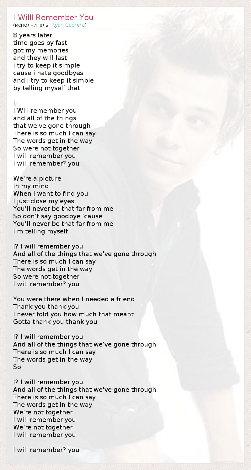 8 years later time goes by fast got my memories and they will last i try to keep it simple cause i hate goodbyes and i try to keep it simple by telling myself that I, I Will remember you and all of the things that we've gone through There is so much I can say The words get in the way So were not together I will remember you I will remember? you We're a picture In my mind When I want to find you I just close my eyes You'll never be that far from me So don't say goodbye 'cause You'll never be that far from me I'm telling myself I? I will remember you And all of the things that we've gone through There is so much I can say The words get in the way So were not together I will remember? you You were there when I needed a friend Thank you thank you I never told you how much that meant Gotta thank you thank you I? I will remember you And all of the things that we've gone through There is so much I can say The words get in the way So I? I will remember you And all of the things that we've gone through There is so much I can say The words get in the way We're not together I will remember you We're not together I will remember you I will remember? you