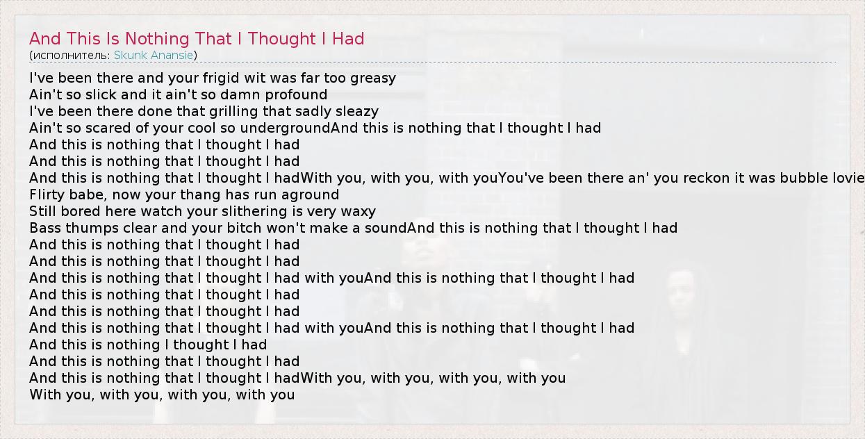 I've been there and your frigid wit was far too greasy Ain't so slick and it ain't so damn profound I've been there done that grilling that sadly sleazy Ain't so scared of your cool so undergroundAnd this is nothing that I thought I had And this is nothing that I thought I had And this is nothing that I thought I had And this is nothing that I thought I hadWith you, with you, with youYou've been there an' you reckon it was bubble lovie Flirty babe, now your thang has run aground Still bored here watch your slithering is very waxy Bass thumps clear and your bitch won't make a soundAnd this is nothing that I thought I had And this is nothing that I thought I had And this is nothing that I thought I had And this is nothing that I thought I had with youAnd this is nothing that I thought I had And this is nothing that I thought I had And this is nothing that I thought I had And this is nothing that I thought I had with youAnd this is nothing that I thought I had And this is nothing I thought I had And this is nothing that I thought I had And this is nothing that I thought I hadWith you, with you, with you, with you With you, with you, with you, with you