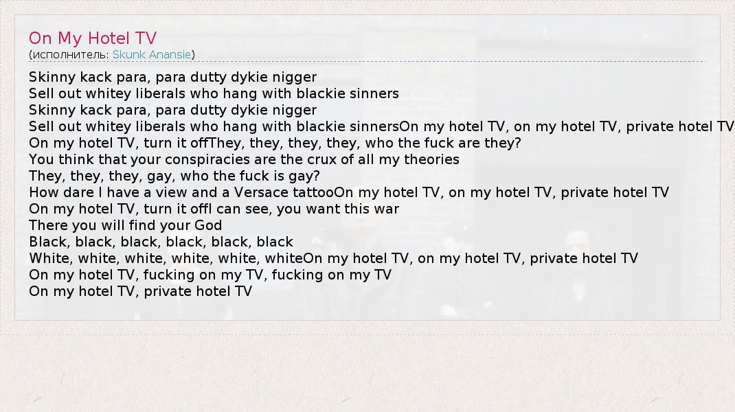 Skinny kack para, para dutty dykie nigger Sell out whitey liberals who hang with blackie sinners Skinny kack para, para dutty dykie nigger Sell out whitey liberals who hang with blackie sinnersOn my hotel TV, on my hotel TV, private hotel TV On my hotel TV, turn it offThey, they, they, they, who the fuck are they? You think that your conspiracies are the crux of all my theories They, they, they, gay, who the fuck is gay? How dare I have a view and a Versace tattooOn my hotel TV, on my hotel TV, private hotel TV On my hotel TV, turn it offI can see, you want this war There you will find your God Black, black, black, black, black, black White, white, white, white, white, whiteOn my hotel TV, on my hotel TV, private hotel TV On my hotel TV, fucking on my TV, fucking on my TV On my hotel TV, private hotel TV
